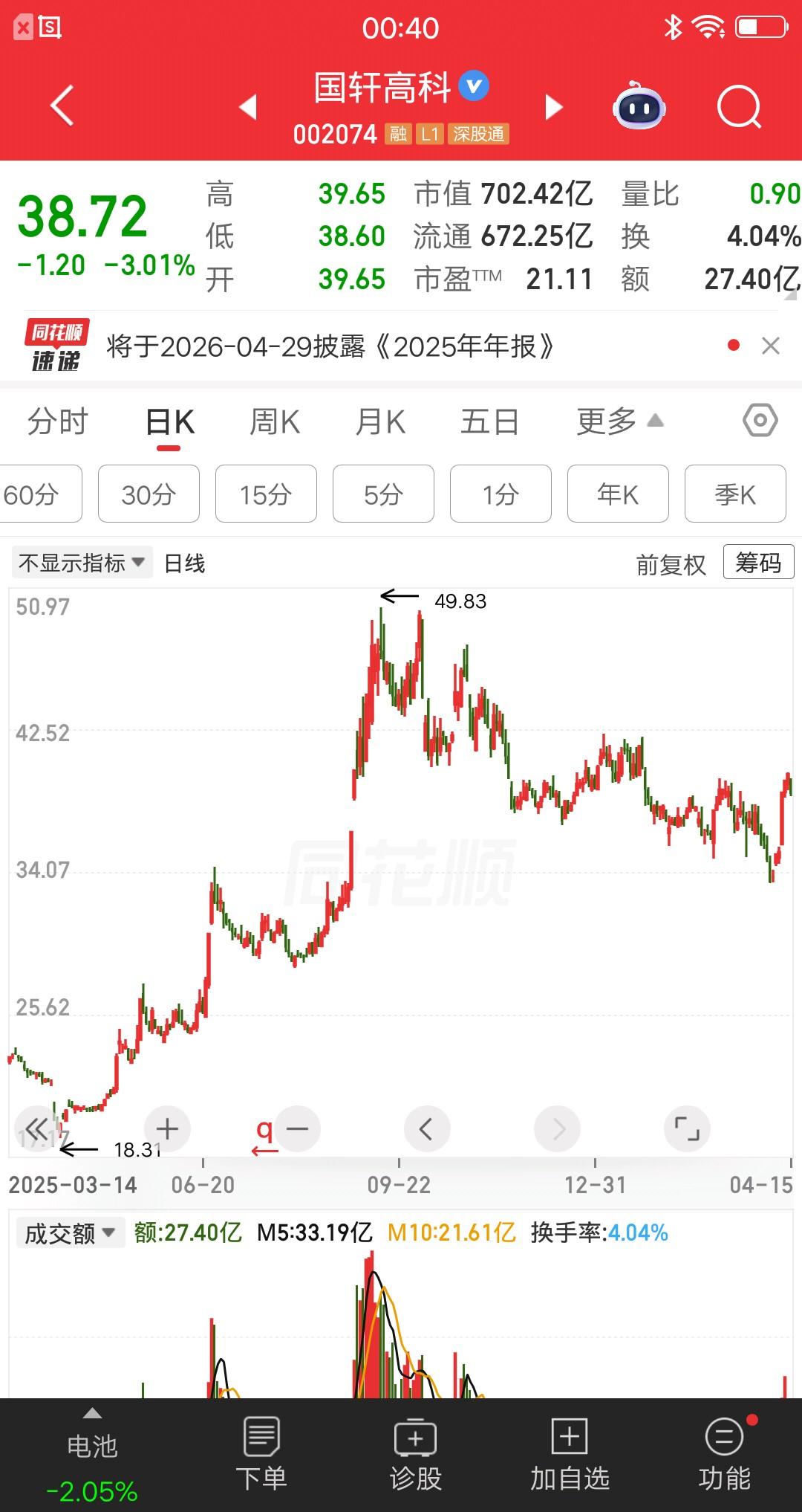 一位湖北的股民,在国轩高科上从大赚到大亏,他真的恨死这只票了。 去年4月初的时候,A股行情非常极端,连续三天大跌,可能有人还有印象。当时特朗普上台搞了对等关税,市场资金被吓懵了,疯狂卖出。他学巴菲特,别人恐惧我贪婪。在19.13元买了5000股,买完以后股价开始回升,他持有两个多月,觉得差不多了,在24.61元止盈出局,大赚28%。 他自以为卖在高点了,心情十分得意,没想到是卖在半山腰了。股价持续上涨,最高涨到49元,他非常后悔卖太早了。拿起计算器算了下,整整少赚了一倍的利润,他越想越懊恼,非常不甘心。于是在45块元,再次全仓梭哈了。心想一定要拿住了,不能再卖飞了,然而这次没那么幸运。 之后股价震荡下跌,目前最新价38元多,账户浮亏约16个点。虽然套的不深,但是拿了半年了,心态扛不住了,经常在想是不是牛市结束了。 有句话叫,会一万种模式,不如一种模式做一万遍。如果他坚持暴跌买入,肯定是不会亏钱的。