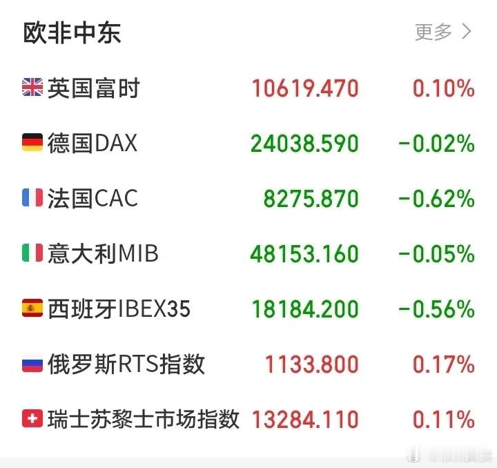 截止发稿,英国富时上涨0.10%,德国DAX下跌0.02%,法国CAC下跌0.62%,意大利MIB下跌0.05%,西班牙IBEX35也下跌了0.56%,跌多涨少!