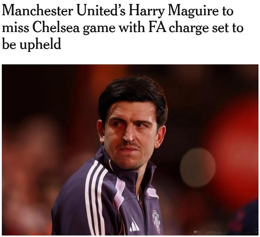 英足总官方公告:“马奎尔在3月20日星期五曼联对阵伯恩茅斯的英超联赛中,于第78分钟被罚下场,随后遭到指控。据称,这名后卫在被罚下后行为不当,对第四官员使用了侮辱性言语,马奎尔需要在4月2日星期四之前做出回应。”