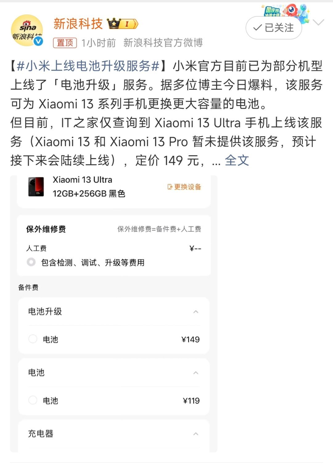 小米上线了电池升级服务,目前支持13系列: