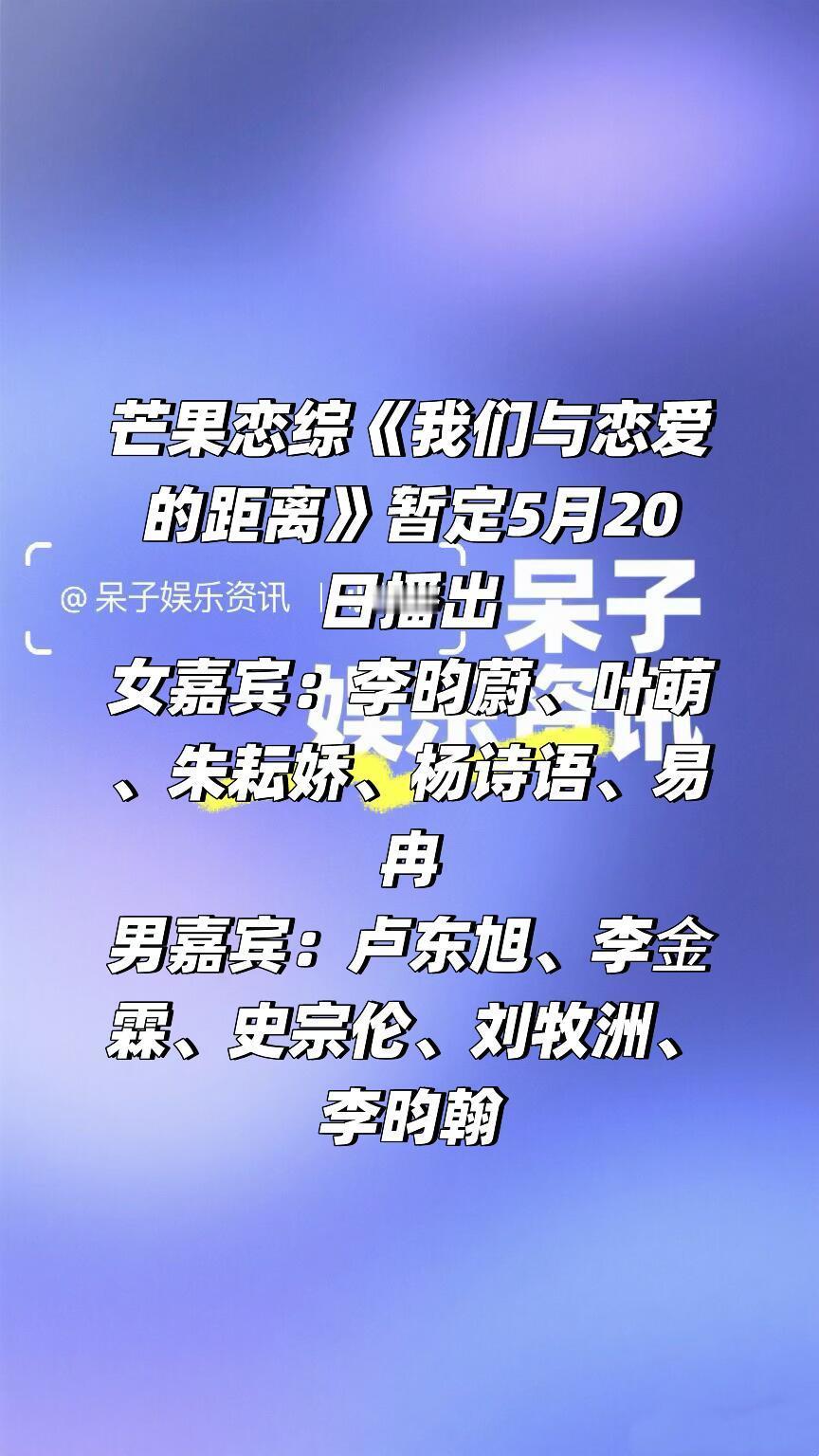 芒果恋综《我们与恋爱的距离》暂定5月20日播出女嘉宾:李昀蔚、叶萌、朱耘娇、杨诗语、易冉男嘉宾:卢东旭、李⾦霖、史宗伦、刘牧洲、李昀翰