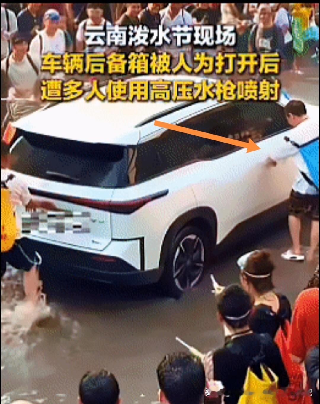 云南泼水节现场,车辆行驶过程中,后备箱和车门被陌生男子打开,多人使用水枪喷射,直接变成水泡车了。 4月15日,网上传出一段视频,在云南泼水节的现场,一辆新能源汽车穿过泼水节现场,行驶过程中,车辆的后备箱打开了,然后路边的众人就拿着水枪对着车里喷水。 从现场的视频可以看到,车辆行驶的时候,一名白衣男子伸手去摸了一下后备箱的开关,然后门才打开的。期间还有一名男子,伸手去打开车辆的副驾驶,最后门也被打开了,有两三个人对着副驾驶喷水。 这么多人朝里面喷水,里面的内饰和地板肯定进了不少水,如果一时干不了的话,肯定会造成车内零部件生锈,车内也会有异味。 为什么车辆行驶过程中,别人能开门呢?看视频应该车辆刚刚起步,速度比较慢,车门还没有自动落锁,所以才会被车外的人打开。 有网友表示,开门的和喷水的不地道,不应该往车厢里喷,十几万多车,直接变成水泡车了。 也有网友说,成年人应该为自己的行为负责,如果烘干或者维修需要一些费用,应该让这两个打开车门的人负责。