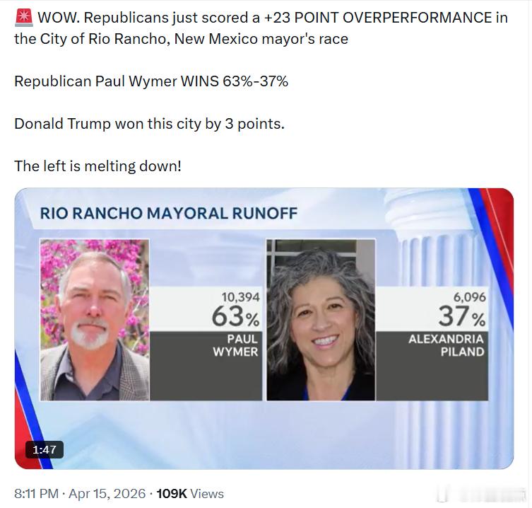 共和党在新墨西哥州里奥兰乔市市长选举中取得了高达+23个百分点的超预期表现。