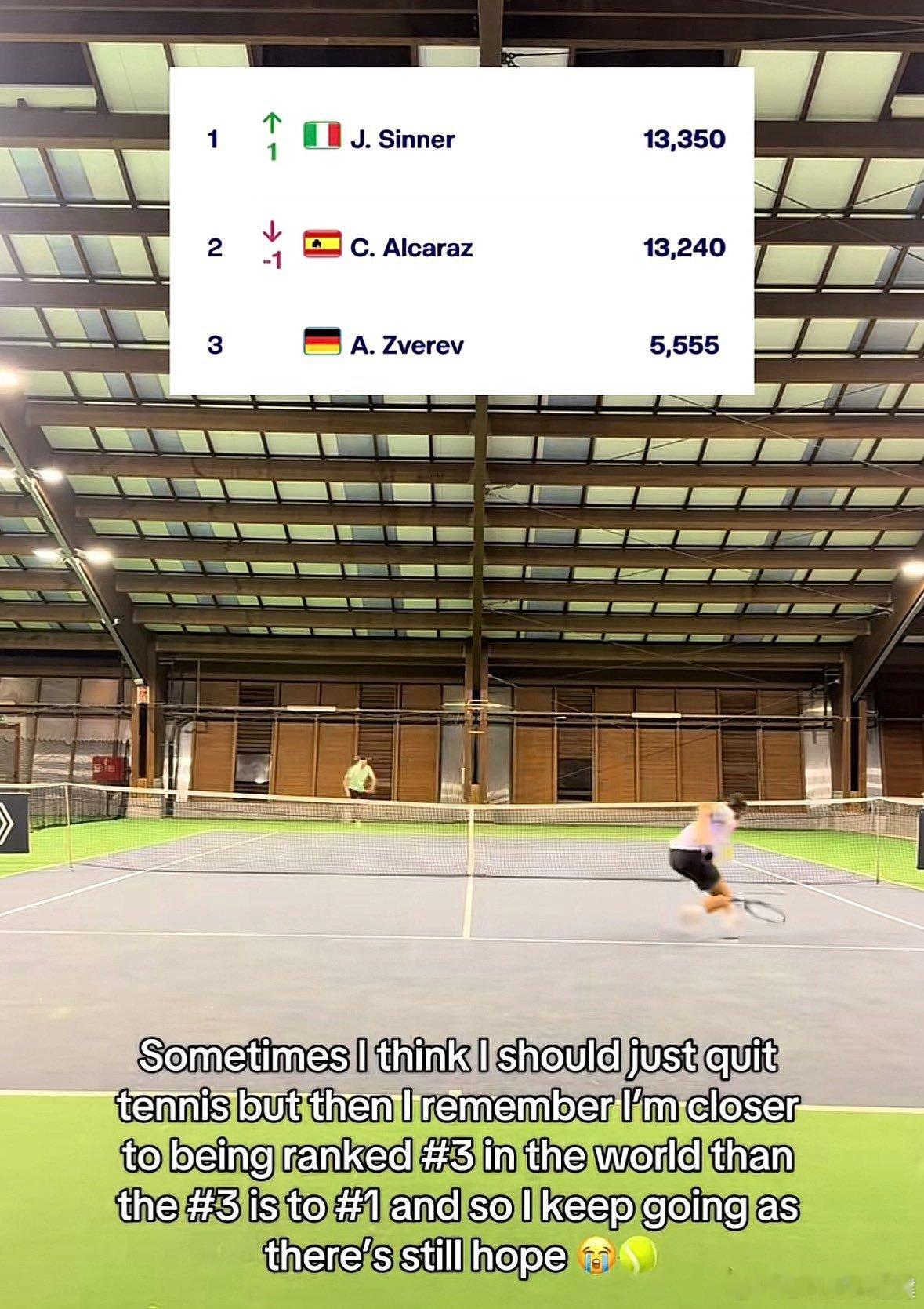 有道理不一位低排名选手:有时我想要退役,但想到我和世界第三的积分差距比世界第三和世界第一的差距要小,我就又有希望了!ps:图二的观众好像辛纳ATP红土撒野季