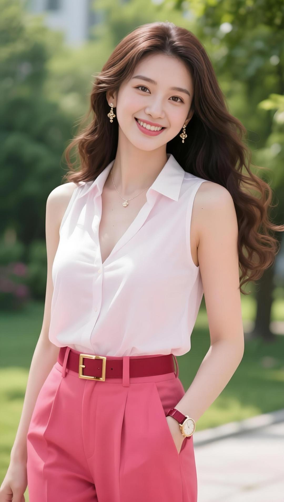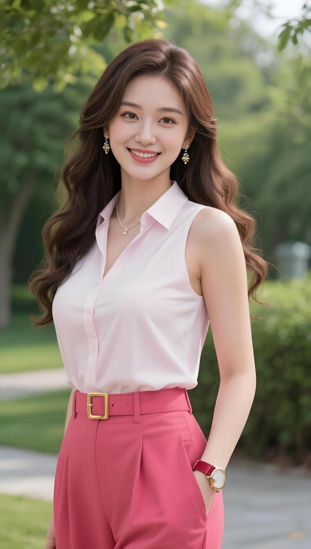 温柔甜美的少女,自然卷发,粉色花朵连衣裙,清新自然。