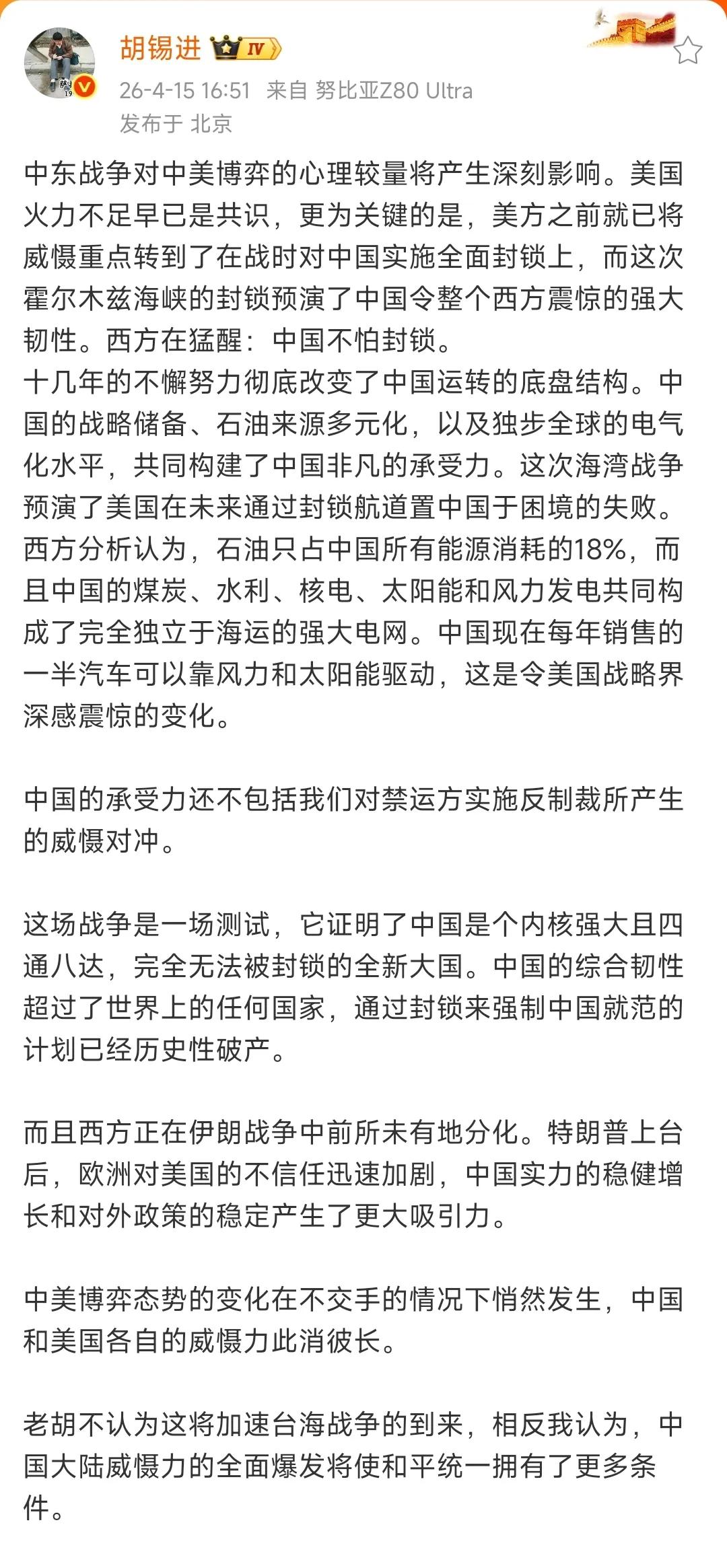 胡锡进今天这篇文章讲得很有道理,我基本上同意他的观点。 胡锡进认为,美国早就将威慑重点转移到了战时对中国的全面封锁上,美国这次对霍尔木兹海峡的封锁,实际上是对将来全面封锁中国进行的一次预演。但结果却让西方国家猛醒——中国不怕封锁。 胡锡进的这个判断我认为基本上正确的。其实从中东战争开始时起,对中国及其他很多国家进行封锁的测试就已经开始了。几十天来的实践证明,这些封锁对中国没有多大用处。国内除了油价明显上涨之外,基本上没有引起任何波动。 美国原本以为,把霍尔木兹海峡一卡、对伊朗石油一禁,就是掐住了中国的能源脖子,本质上就是在提前演练未来全面围堵中国的剧本。他们想看看中国慌不慌、乱不乱,想靠封锁逼我们低头让步。 可结果却狠狠打了他们的脸。 中国根本没被封锁住。能源渠道照样转,贸易照样跑,国内社会稳得很,除了油价有点上浮,整个国家运转如常,没有出现任何他们预想中的混乱和被动。甚至还腾出手来帮助了几个周边国家度过难关。 这恰恰说明,中国早已不是那个容易被人卡脖子的国家。我们有足够的战略纵深、多元的能源通道、强大的国内市场和完整的产业体系,这种综合韧性,真不是随便一封锁就能打垮的。 西方这次算是彻底看明白了:想用封锁逼中国就范,这条路从根上就走不通了。他们的封锁威慑,在现实面前已经彻底失效。这不是嘴硬,是几十天实打实的结果证明 —— 中国,确实封不住、困不倒、吓不怕。