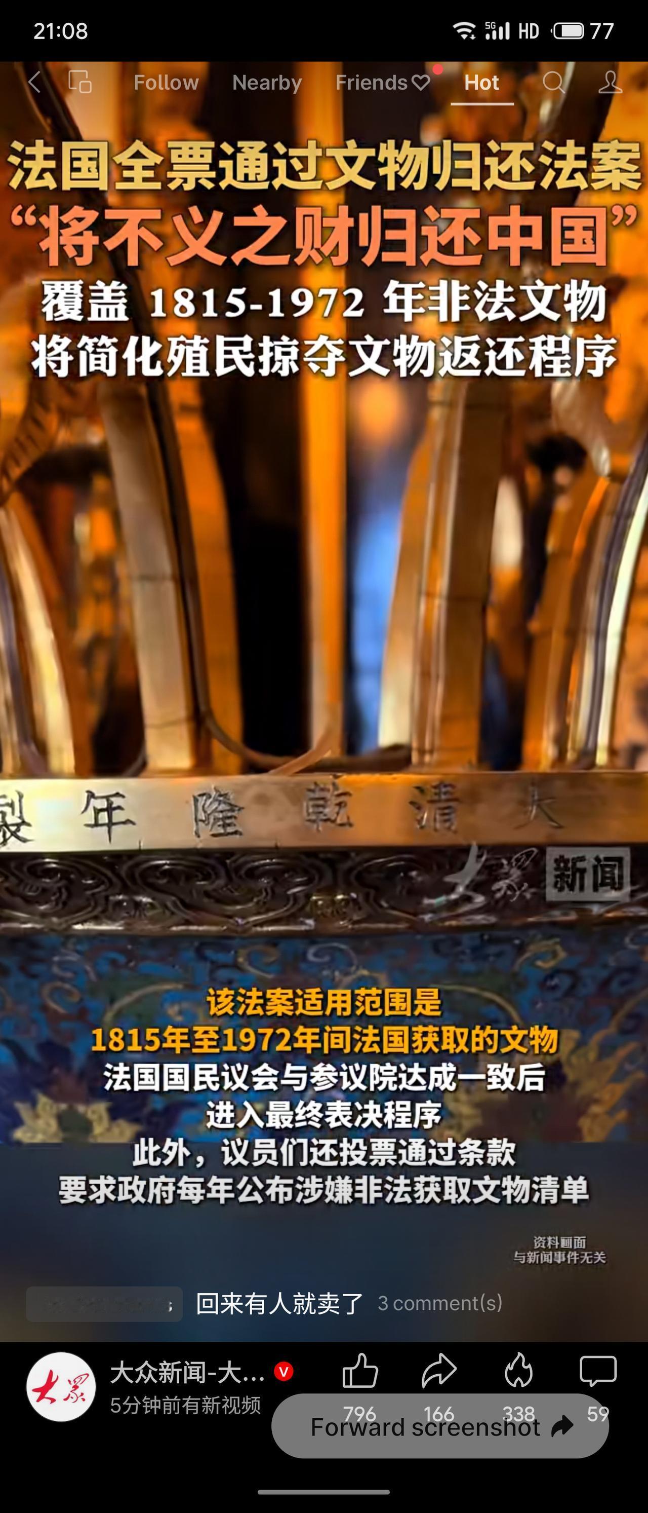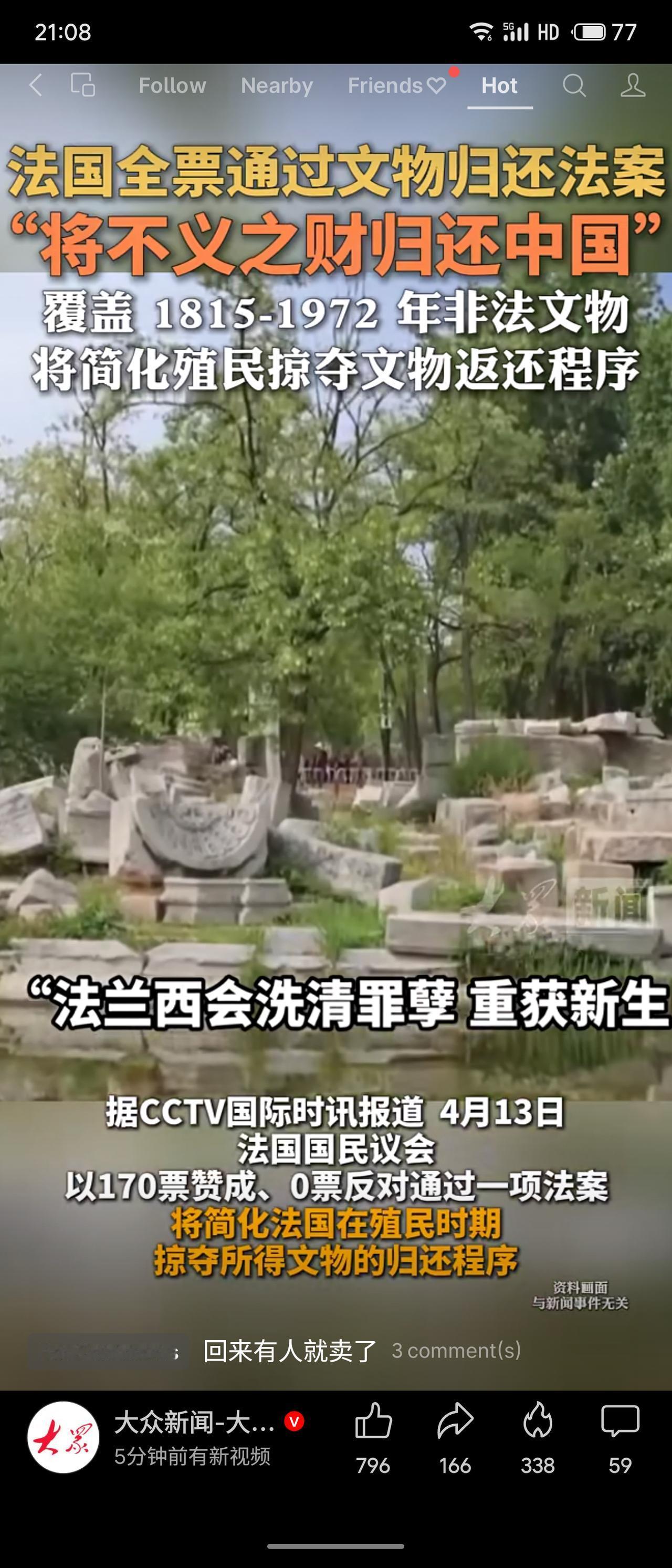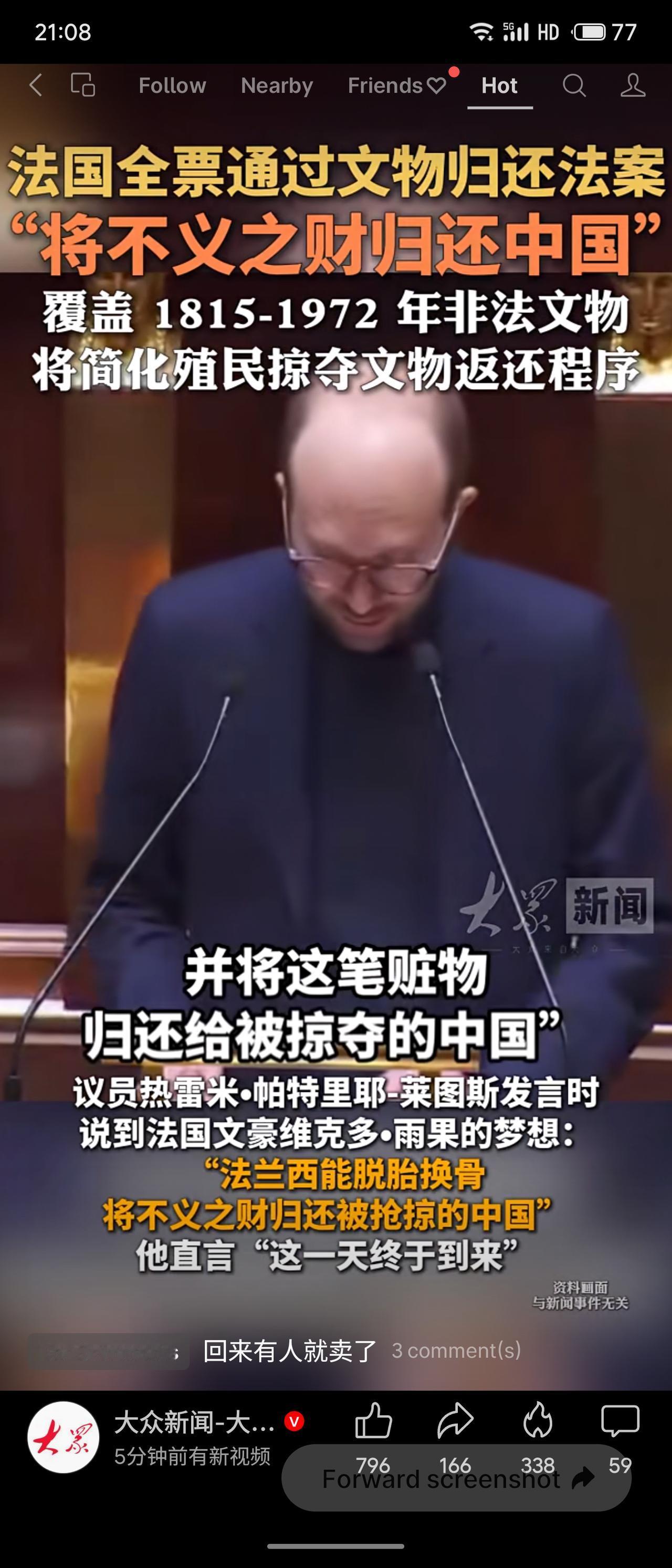 法国国民议会全票通过文物归还法案,简化殖民时期掠夺文物的返还程序,覆盖1815至1972年间非法获取的文物。议员引用雨果的梦想,称“法兰西将不义之财归还被抢掠的中国”,并强调“这一天终于到来”。法案还要求政府每年公布涉嫌非法获取的文物清单。