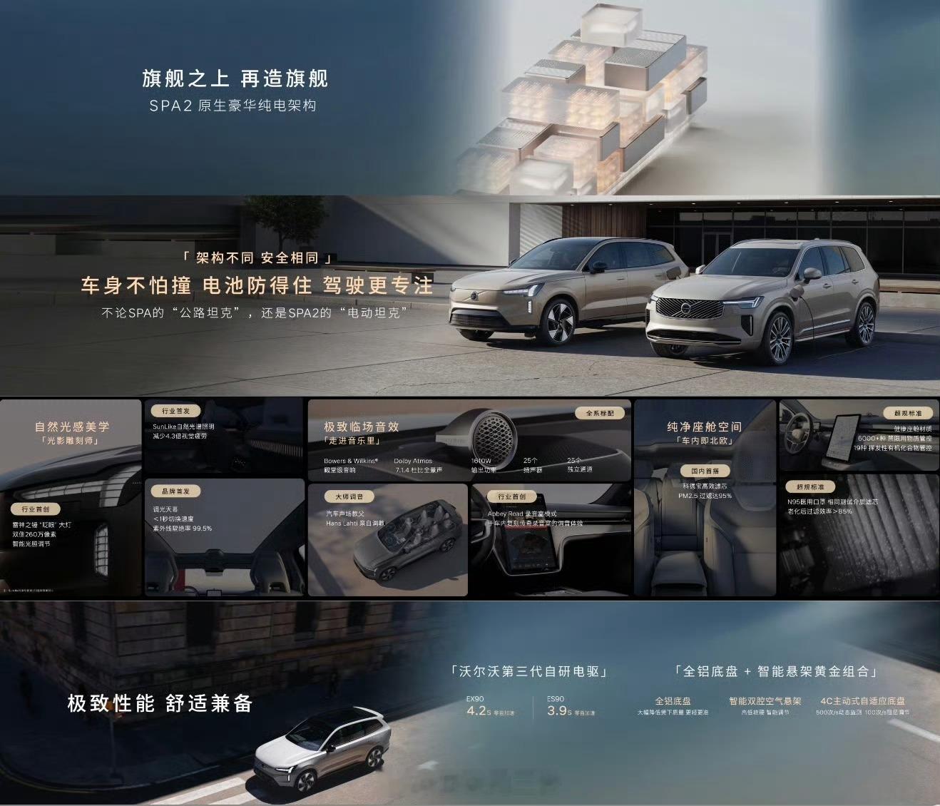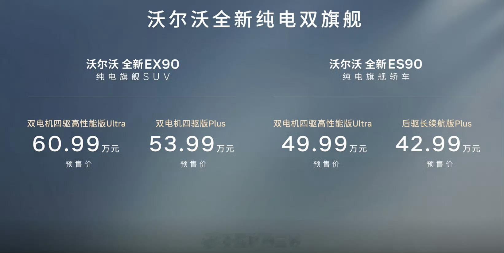 沃尔沃纯电双旗舰开启预售沃尔沃纯电双子星EX90、ES90今日正式预售,价格来了:SUV EX90 53.99-60.99万,轿车ES90 42.99-49.99万。