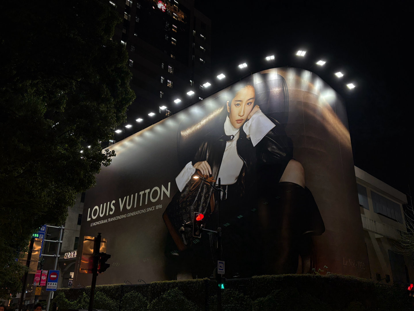 晚上的大地广真酷,上海新天地朗庭酒店对面刘亦菲LV地广硬广,LV Monogram 130周年大地广,内娱拍过的最高级最重磅的LV广告没有之一。周年>成衣>或等于箱包