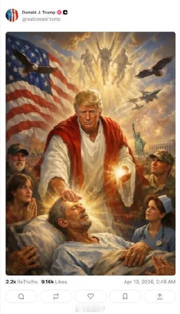 川普用AI制图使自己像耶稣一样治病救人,使世人震惊,并引起包括教宗在内的宗教界人士批评。川普不得不撤除了先前制图,并重新贴了一个他”聆听耶稣教诲“的图。网图