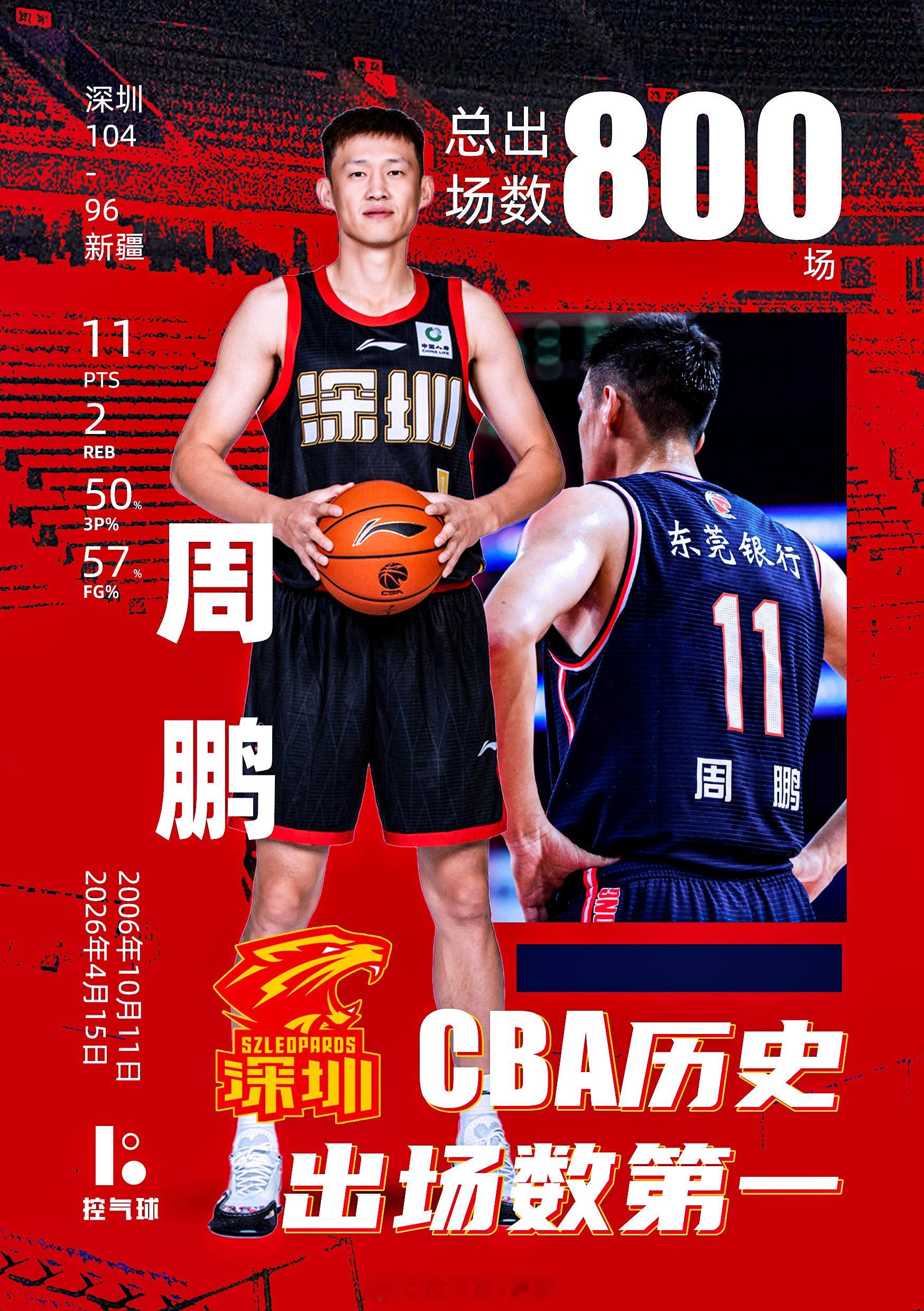 14连胜+历史里程碑!深圳104-96力克新疆,周鹏迎来CBA生涯800场里程碑,成为历史首位达成此成就的球员。末节新疆疯狂追分之际,他在弧顶连中两记致命三分稳住局势,全场11分尽显定海神针本色,老兵不死,只会继续闪耀!周鹏历史出场数CBA第一新疆男篮vs深圳男篮