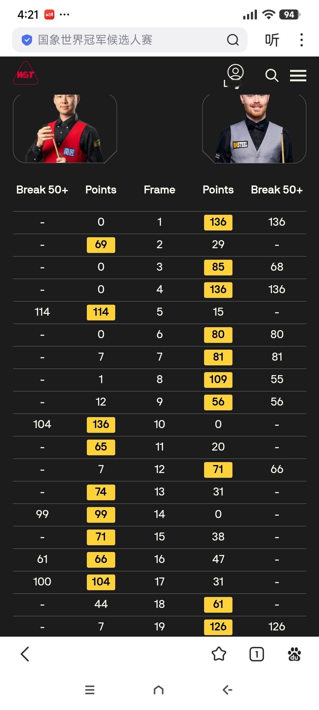 徐思没能力挽狂澜! 4月16日,在斯诺克世锦赛资格赛第三轮的比赛中,中国球员徐思险些创造神奇! 第一阶段2-7落后加里·威尔逊,命悬一线! 第二阶段徐思脱胎换骨大爆发! 打出两杆破百两杆50+!7-1加里·威尔逊! 前17局,徐思9-8领先来到赛点。 第18局,加里威尔逊挽回一个破发点! 决胜局徐思功亏一篑! 加里·威尔逊10-9逆转徐思获胜晋级正赛。