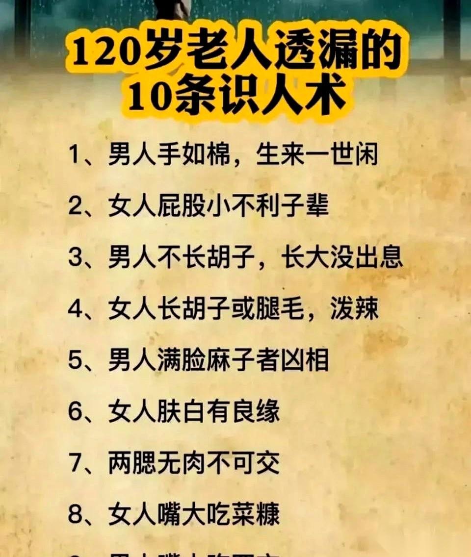 网上刷到个帖子,说是一位120岁老人传下来的十条“识人术”,我差点把手机捏碎。 第一条就说,男人手软得像棉花,这辈子就不愁吃穿。我摊开自己手掌,上面全是茧,活该我天天搬砖? 更离谱的在后面。 说男人嘴大吃四方,是福相。转头又说,女人嘴大吃菜糠,是穷命。好家伙,一张嘴,男女待遇差这么多?这哪是识人,这是直接给性别下判决书。 还有什么女人屁股小就生不了孩子,男人不长胡子就没出息……一条条看下来,感觉我周围的朋友,就没一个“合格”的。 我爸嘴就不大,不也照样撑起一个家。 我就想问问,这到底是老祖宗的识人智慧,还是那个年代的刻板偏见?