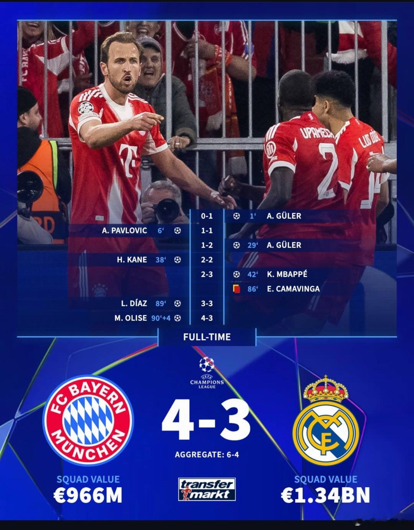 拜仁4比3皇马有惊无险!今天两场欧冠,和昨天一样最终首回合落后球队都未能翻盘。四强出炉!大巴黎vs拜仁,马竞vs阿森纳。法甲、德甲、西甲、英超各剩一支独苗。拜仁还是火力强悍,纵使皇马在拜仁主场可以打进3球,拜仁仍然可以4球还以颜色。阿森纳进攻交出白卷,但好歹继续可以守住0比0。现在欧冠顺利进入四强,就看周末和曼城的决战了!阿森纳欧冠联赛