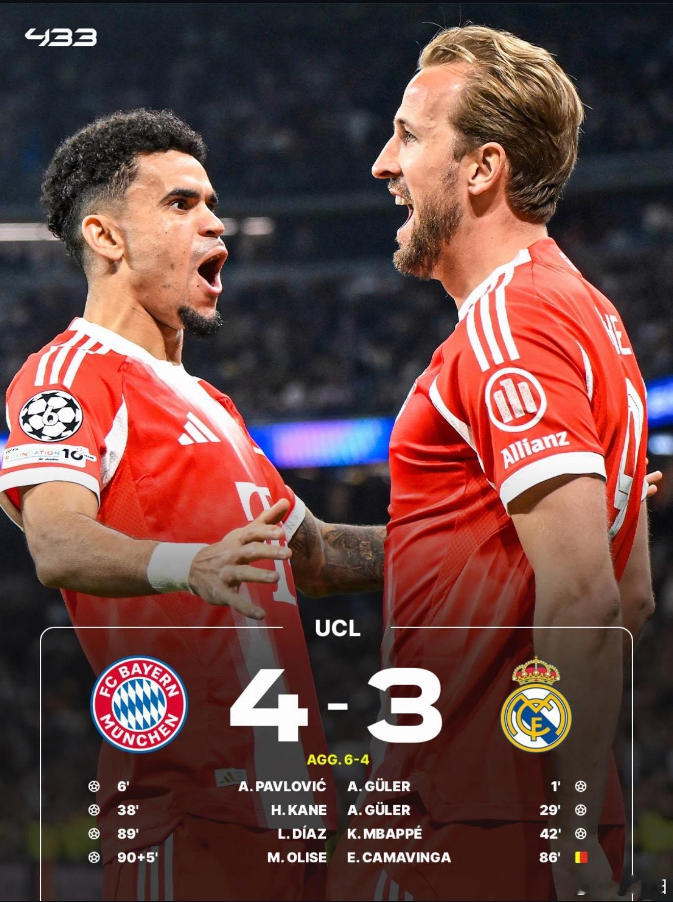 拜仁4比3皇马有惊无险!今天两场欧冠,和昨天一样最终首回合落后球队都未能翻盘。四