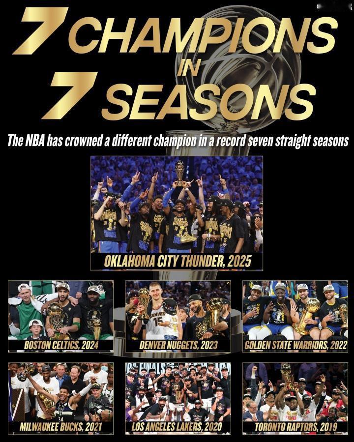 过去7年7个不同的NBA冠军 2019:猛龙(东部) 2020:湖人(西部) 2021:雄鹿(东部) 2022:勇士(西部) 2023:掘金(西部) 2024:凯尔特人(东部) 2025:雷霆(西部) 2026:? 7年7个不同的冠军,这已经是NBA历史上的最长记录了。 在比赛节奏越来越快的当下,总冠军需要的运气比例在不断上涨,谁能保持相对的健康,谁就能走的更远,剩者为王快成为铁律了。 而本赛季至今,雷霆、掘金、马刺、凯尔特人等队伍也有不同程度的伤病,季后赛开始前,已经恢复到了相对满员的状态。现在就看谁能全须全尾的打到总决赛了。 至少目前为止,雷霆是有希望连冠的。