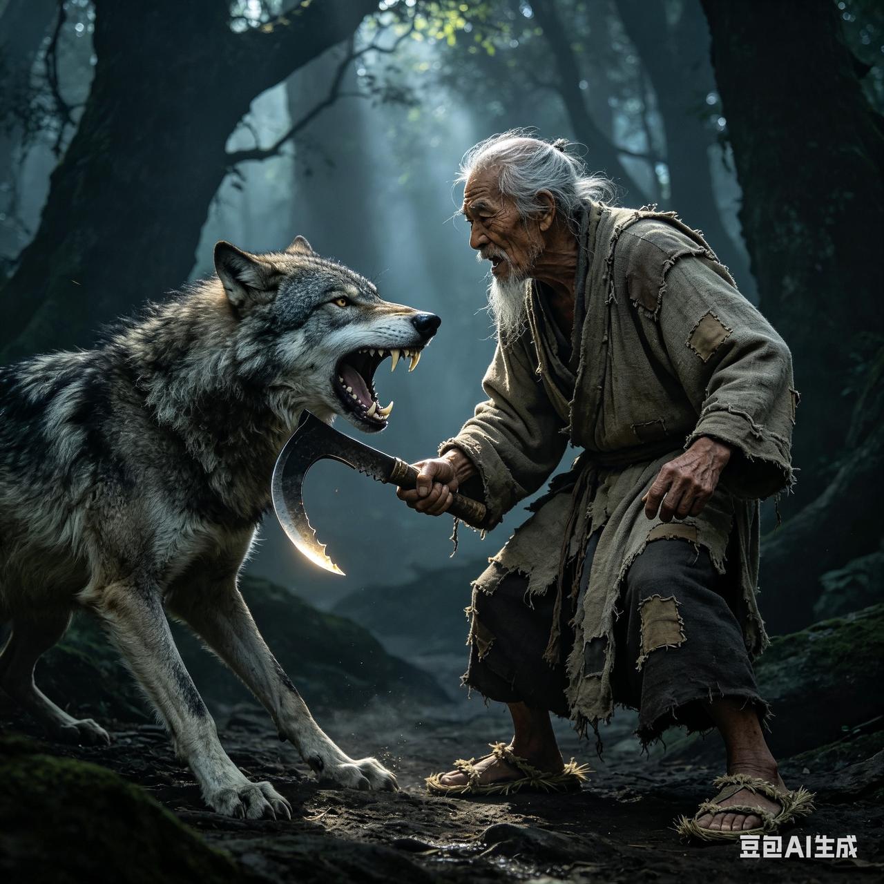 明朝万历年间,虾公岭下有个老樵夫。一日上山砍柴,又困又乏,便倒在一棵大树下歇息,不知不觉竟睡着了。 迷迷糊糊中,忽觉脸上一阵奇痒。睁眼一看,一只老狼正用尾巴梢在他脸上扫来扫去。 老樵夫心里明白:这狼是想先把他弄醒,再咬死吃掉。 他也不怕,悄悄摸出身后的镰刀,猛地砍了过去——“唰”的一声,狼尾巴应声落地。老狼惨叫一声,负痛逃走了。 过了半个月,老樵夫正在砍柴,那只没了尾巴的老狼又扑了上来。看来是铁了心要报断尾之仇。它张着血盆大口,呲着尖牙,两眼泛着凶光,上蹿下跳,频频向老人发起猛攻。 老樵夫挥动镰刀,与狼厮杀了半个时辰。无奈年老体衰,渐渐没了力气,身上也被咬了好几处伤口。 他心知今日难逃一死,索性放弃抵抗,长叹一声,倒在地上,闭眼等死。 谁知那老狼见状,竟吓得哀嚎一声,掉头就逃。 原来,老狼吃一堑长一智,生怕老人又像上次那样突施杀招——上次割了尾巴,这次说不定要割什么呢! 老樵夫就这样在万分危急中,糊里糊涂地捡回了一条老命。