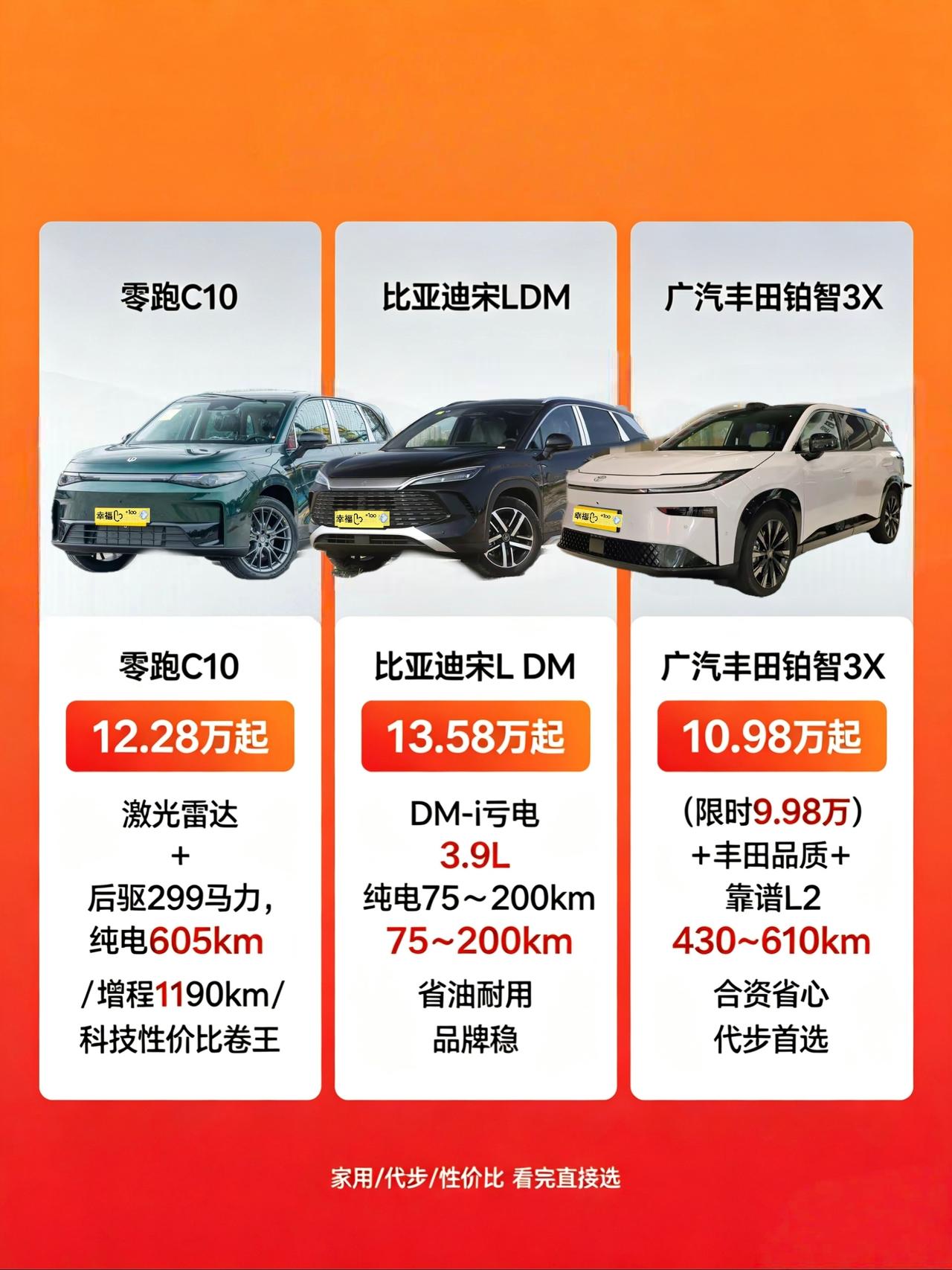15万级热门中型SUV怎么选?零跑C10、比亚迪宋L DM、广汽丰田铂智3X三车横评 后台好多兄弟问15万左右买啥SUV,这个价位正好是国产新能源和合资品牌正面硬刚的地带。今天咱们就唠三台热门中型SUV:零跑C10、比亚迪宋L DM、广汽丰田铂智3X。 一台是新势力性价比卷王,一台是比亚迪插混销量担当,一台是丰田合资品质代表。咱们不整虚的,优缺点全给它扒干净。 一、零跑C10|12.28万起 一句话:15万级唯一带激光雷达的新势力SUV,性价比拉满但品牌服务网点还在铺。 零跑C10这车最近热度是真的高,销量持续走高、稳居15万级新能源SUV前列,4月份刚出了改款,产品力又往上提了一截。尺寸4739mm车长、2825mm轴距,后排地台纯平,坐三个人不挤,后备箱最大能扩展到835L,婴儿车随便塞。 优点: 真·激光雷达下放:13.28万就能买到带激光雷达的版本,高通8650芯片+高速领航+自动泊车,这个配置在合资车上得20万往上 动力够用:纯电版后置后驱299马力,零百加速约7.7秒,家用完全够用,起步轻快不拖沓 续航扎实:纯电版CLTC最高605km,增程版纯电210km+综合1190km,快充30-80%只要16分钟 座椅舒服:后排用的是婴儿可啃咬级有机硅面料,带娃家庭直接加分 槽点: 品牌还在爬坡:零跑的4S店和售后网点没丰田比亚迪多,三四线城市可能得跑远路 用户实测底盘偏硬:过减速带有点颠,不如铂智3X调校得软 车机偶尔卡:14.6寸大屏流畅度中上水平,但地图缩放偶尔会有延迟 适合追求性价比、看重智能驾驶、对动力有要求的年轻家庭。这车就是那种“花小钱办大事”的类型。 二、比亚迪宋L DM|13.58万起 一句话:第五代DM-i省油是真省,多版本纯电续航可选,当油车开也划算。 宋L DM是比亚迪在15万级插混SUV里的主力选手,4780mm车长、2782mm轴距,尺寸和C10差不多,但轴距短了43mm。搭载比亚迪第五代DM-i系统,WLTC亏电油耗低至3.9L/100km。 优点: 真·省油王:WLTC亏电油耗3.9L,当油车开也比同级燃油车省一半 纯电续航灵活:提供75/112/160/200km多版本CLTC纯电续航,满油满电能跑近1400公里,日常通勤完全可以当电车开 品牌硬:比亚迪现在是国内新能源老大,开出去不丢面,保值率也稳 刀片电池安全感:比亚迪自研电池,安全性经过了市场检验,还有三电终身保修 后备箱大:后排放倒能扩到1440L,露营装备随便塞 槽点: 智能化无短板但无亮点:全系标配L2+,中控屏12.8英寸,比C10小一圈 后排空间略紧:2782mm轴距,180cm身高坐后排只剩不到2拳,比C10局促 适合充电不方便想当油车开、看重品牌和保值率的用户。这车就是“省油又省钱”的典型。 三、广汽丰田铂智3X|10.98万起(限时补贴后9.98万起) 一句话:合资品质+靠谱L2,续航有610km可选,但动力弱一档。 铂智3X是丰田和广汽合作的纯电SUV,4600mm车长、2765mm轴距,尺寸比C10小一圈。定位就是城市通勤代步,主打可靠和实用,限时补贴可享1万元优惠。 优点: L2辅助驾驶口碑好:自动泊车和高速领航用户实测好评率高,新手开这车心里有底 丰田金字招牌:合资品质+“三担责”承诺,适合不太信任新势力的保守派 续航版本多:提供430km、520km、610km三种续航可选,高配版比C10还能多跑5公里 后排空间利用率高:用户实测1米8大个乘坐空间宽裕,座椅放倒能当床,露营睡觉妥妥的 槽点: 动力偏弱:150kW电机约201马力(610 Max版165kW约221马力),前驱,0-50km/h 3.7秒,体感零百约8秒级 配置要加钱:电动尾门、座椅加热都得选配,低配版配置基础 车身尺寸小:4米6的车长,在三个车里最短,气场差点意思 适合看重合资品牌、对智能驾驶要求不高、主要在市区通勤的佛系用户。这车就是“省心但动力一般”的选择。 四、一句话总结 零跑C10:12.28万起,新势力性价比卷王。激光雷达下放到13万级,299马力后驱,605km续航,适合追求科技感和动力的年轻家庭。 宋L DM:13.58万起,比亚迪省油王。多版本纯电续航,亏电油耗3.9L,满油满电近1400公里,适合充电不便、看重品牌的用户。 铂智3X:10.98万起(限时补贴后9.98万起),合资靠谱型。提供430-610km续航,L2辅助驾驶口碑好,丰田品质背书,适合保守派和城市通勤用户。 再啰嗦一句:零跑C10是性价比+科技感的代表,宋L DM是省油+品牌的选择,铂智3X是合资+省心的保守派。你最看重啥?评论区聊聊,帮你再细抠一下【来自懂车帝车友圈】