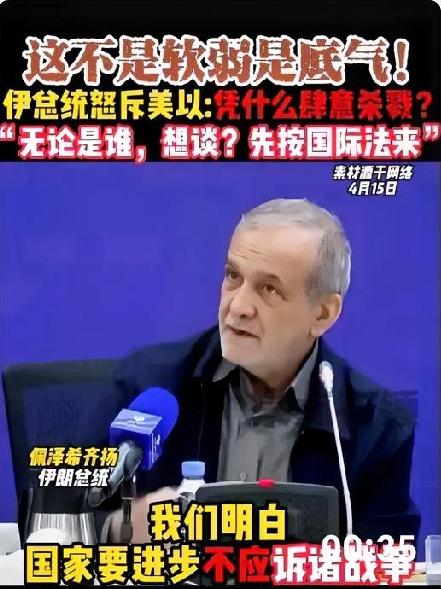 伊总统佩泽希齐扬公开讲话:严正谴责美国发动对伊袭击! 连发五重拷问质问国际法理! 4月14 日,伊朗总统佩泽希齐扬发表公开讲话,对美国针对伊朗发动的袭击予以强烈谴责。他直指美方行动严重缺乏合法性,并通过一连串犀利的质问,深刻质疑美国动武的理由及其行为是否背离了国际法准则。 △总统的五重质问一一在讲话中,佩泽希齐扬情绪激昂,连续抛出五个直击灵魂的问题,以此控诉美方的暴行: →“究竟凭什么攻击我们的主权国家?→凭什么杀害我们的领袖?→又凭什么对我们的指挥官、科学家乃至无辜学生痛下杀手?→哪一条国际法条款授权在战争中轰炸桥梁与工厂? →国际法中又有哪一行文字允许将医院、诊所和大学列为打击目标?” △重申立场与呼吁:佩泽希齐扬在谴责的同时,郑重强调了伊朗的一贯立场:伊朗从不寻求地区动荡,且始终恪守国际法规范。他据此向国际社会发出呼吁,指出其他国家理应遵循同一套国际法则,任何双重标准都是不可接受的。