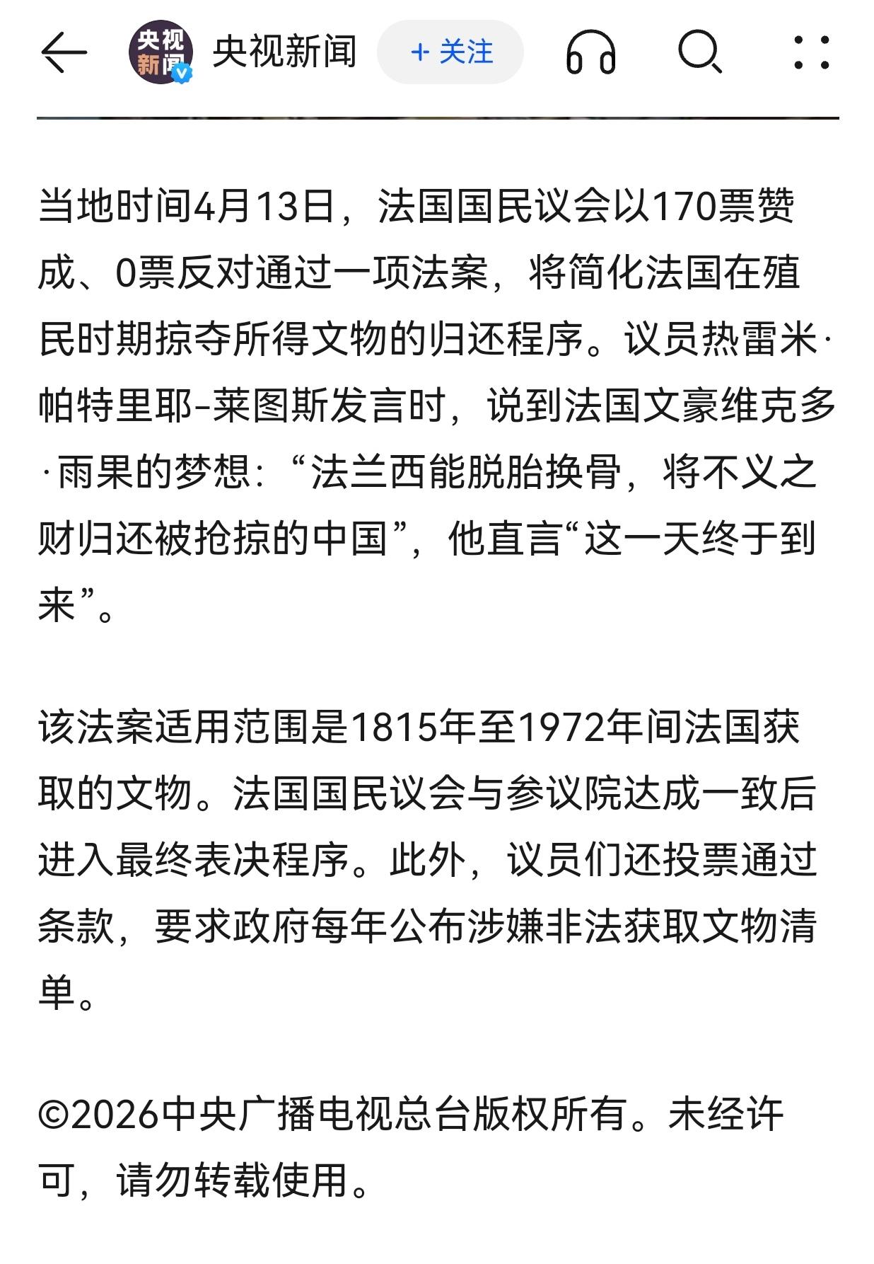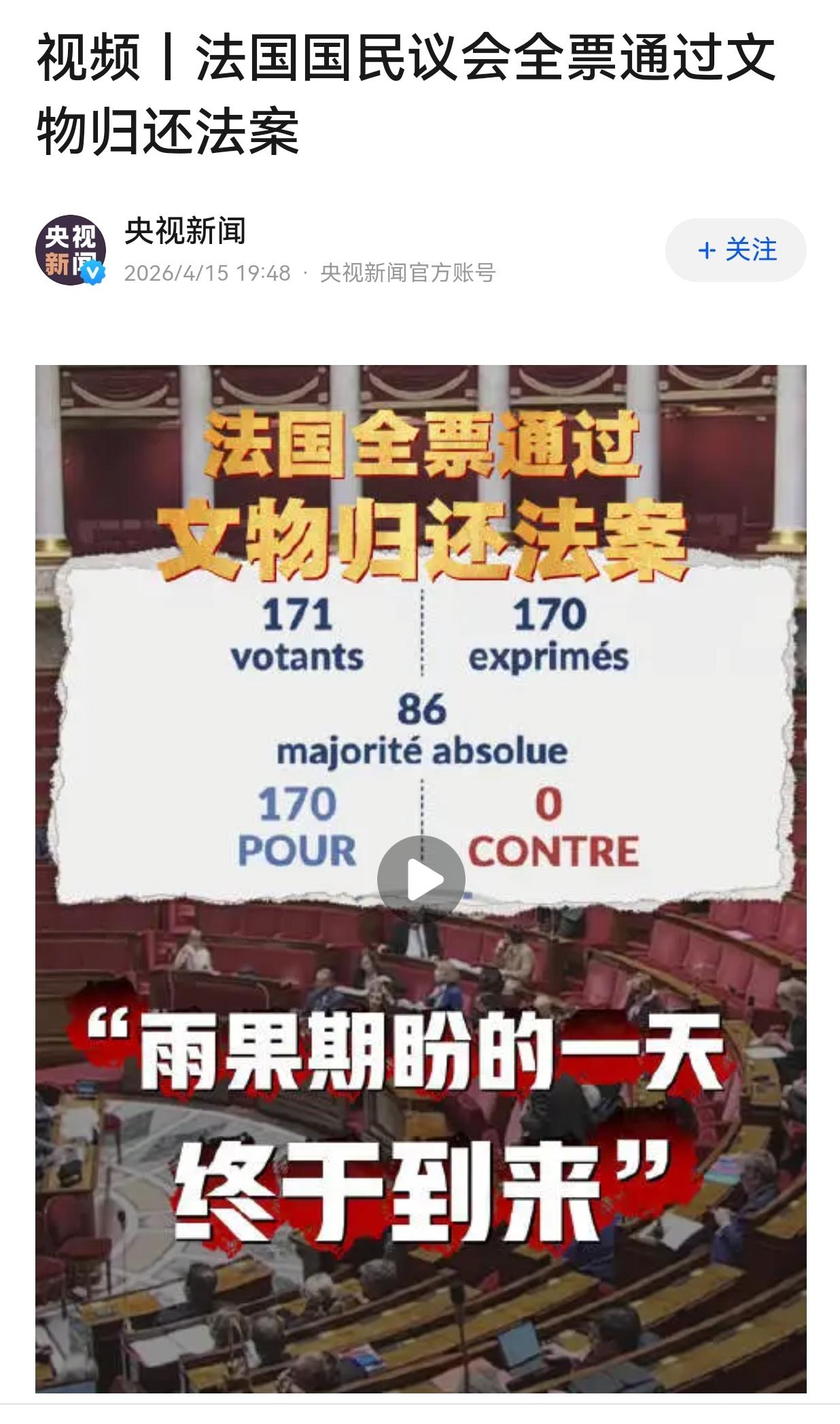 当地时间4月13日,法国国民议会以170票赞成、0票反对通过一项法案,将简化法国在殖民时期掠夺所得文物的归还程序。 有议员称,法国文豪维克多·雨果的曾说过的:“法兰西能脱胎换骨,将不义之财归还被抢掠的中国”的这一天终于到来了。 据悉,该法案适用范围是1815年至1972年间法国获取的文物。法国国民议会与参议院达成一致后进入最终表决程序。