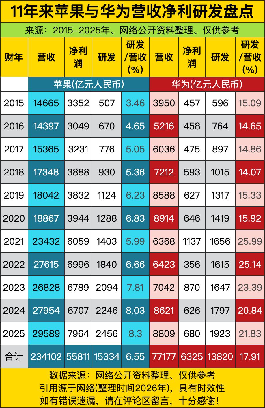 苹果十年砸了15334亿搞研发,占营收6.55%——听着像“科技贵族”的优雅自律,实则是在库克的Excel表里,每多花1块钱研发费,就得少发0.8块股东分红,连iPhone摄像头升级都要先过三轮成本精算,活脱脱一个“精致抠门”的硅谷老会计;反观华为,13820亿研发砸出17.91%的投入占比,2023年单年就烧掉1647亿,比苹果同年还多近600亿,这哪是“追赶”,分明是把实验室当战场、把芯片流片当赌局,连食堂阿姨打菜都默认:“今天又是‘麒麟日’?多给两勺肉,工程师得扛住EDA软件崩溃。” 数据不会说谎:苹果净利润从3352亿飙到7964亿,翻倍靠的是“全球用户为生态付费”的温柔收割——你换新机不是因为旧的坏了,是AirPods和Apple Watch突然不兼容了;华为净利润却在2020年后坐上过山车,从627亿跌到356亿又爬回680亿,像极了那个被断供后蹲在地下室啃泡面、硬是用三年时间把5G基站塞进手机壳里的倔强少年。更妙的是研发投入曲线:苹果稳如钟表匠,每年增幅3%-8%微调;华为则像开手动挡跑山道——2021年突增25.99%,2022年再冲25.14%,2023年23.39%,仿佛在喊:“制裁?那我干脆把整个技术栈重写一遍!” 最耐人寻味的是2025年这张“终局预演”:苹果营收29589亿,净利7964亿; 华为营收8809亿,净利680亿——体量差3.3倍,但华为的研发/营收比仍高苹果一截。这说明什么?当苹果忙着让Vision Pro用户多拍10秒空间视频时,华为正把昇腾芯片塞进港口吊机、把鸿蒙系统装进拖拉机驾驶舱。一个在定义“未来生活的样子”,一个在重塑“基础设施的底色”。有人笑华为“太苦”,可当全世界都在等M系列芯片迭代时,深圳龙岗的实验室里,一群年轻人刚通宵跑完第107版NPU模型,顺手在白板角落画了个小人举着“我们还在”。时代从不偏爱巨无霸,只犒赏那些敢在悬崖边搭脚手架的人。