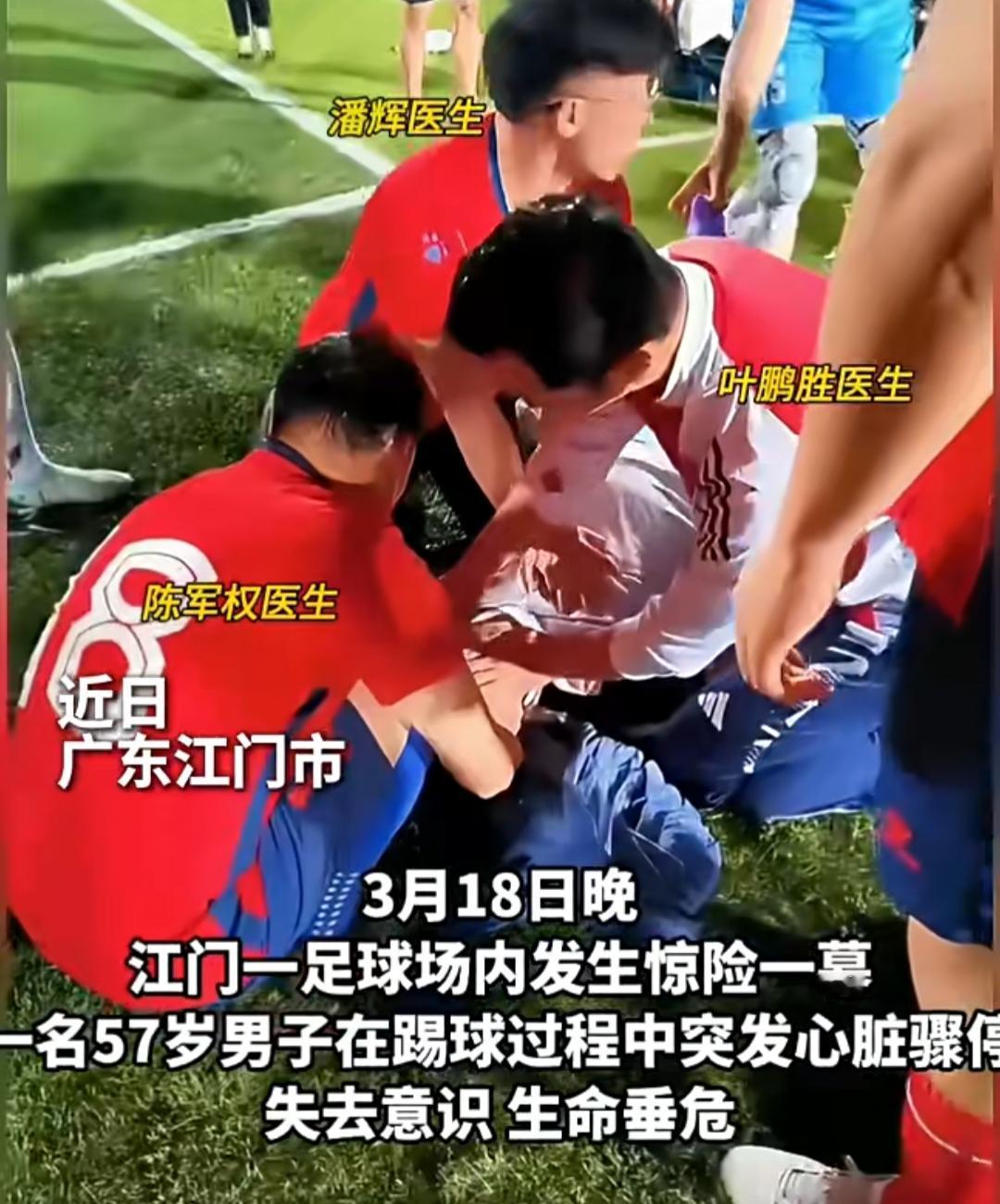 一场普通的业余足球赛,瞬间变成与死神赛跑的生死战场。3月18日晚,广东江门一足球场内,57岁男子踢球时突发心脏骤停,倒地失去意识,生命危在旦夕。就在全场慌乱之际,几名球友的一句话,给了所有人最足的底气:“我们都是医生,放心吧!” 话音未落,陈军权、叶鹏胜、潘辉、董文豪几位医生球友已冲到患者身边,立刻展开专业心肺复苏。按压、通气、评估,每一个动作精准迅速,他们深知,心脏骤停的黄金抢救时间仅4分钟,每一秒都关乎生死。场馆工作人员也火速取来AED除颤仪,一场与死神的接力赛,在球场上紧张上演。 几位医生轮流上阵,持续胸外按压,汗水浸透球衣、手臂酸到发抖,却无人停下。他们一边抢救,一边安抚现场,用专业与冷静稳住了局面。奇迹在坚持中发生:经过数分钟的接力施救,男子逐渐恢复自主脉搏与意识,从死亡线上被硬生生拉回。随后120救护车赶到,将患者送医进一步治疗,目前情况稳定。 这段抢救视频刷屏全网,无数网友为这群“白衣战士”点赞。有人说:“脱下白大褂,他们依然是守护生命的英雄”,也有人感慨:“球场上最帅的不是进球,是拼尽全力的抢救”。 这不是偶然的幸运,而是专业与责任的必然。正是医生们的临危不乱、专业施救,加上AED的及时到位,才为患者抢回了生机。这件事也敲响警钟:运动猝死离我们并不远,掌握心肺复苏技能、配齐AED设备,就是给生命上一份最实在的保险。 总有人用专业与善意,为陌生人撑起一片天。他们是球场上的队友,更是生命里的守护者,用行动诠释了医者仁心的真正含义。足球心脏病 守护生命的英雄