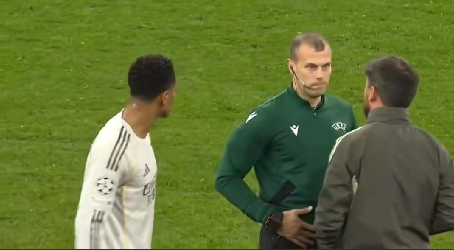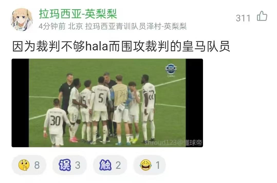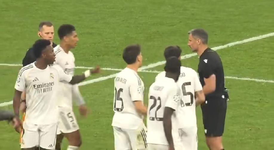皇马卡马文加最后几分钟被罚下,10人皇马最终被拜仁绝杀,赛后皇马球员围住裁判要说法,维尼修斯、贝林厄姆喋喋不休,姆巴佩一脸迷茫。球迷贴出当时皇马球员围攻裁判的图片并附文:因为裁判不够而围攻裁判的皇马队员! “宇宙第一球队”皇马又是四大皆空的一个赛季。姆巴佩规则又又又生效了!