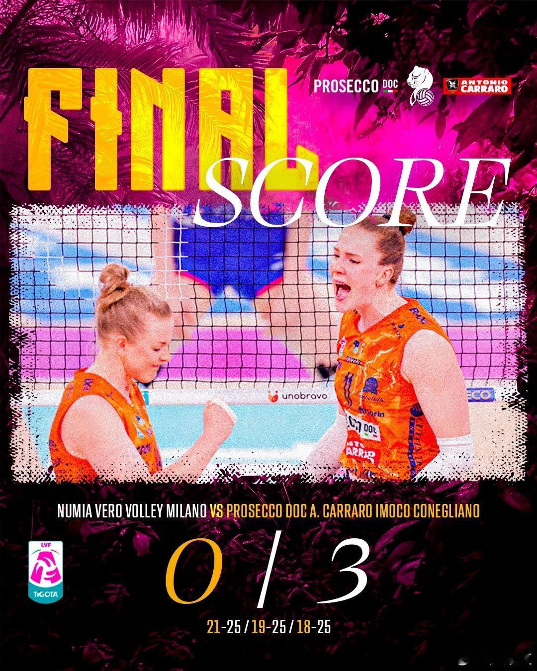 国际排坛动态科内利亚诺意甲女排联赛决赛第二场:科内利亚诺 客场3-0(25-21/25-19/25-18)米兰科内利亚诺总场分2-0领先,再胜一场便可以成功卫冕。4月19日23:59 第三场 科内利亚诺 vs 米兰 朱婷此役贡献8分 27扣8中2失误1被拦 接了全队最多的24个一传0失 到位率62%完美到位率33%科内利亚诺-米兰进攻:49-39;拦网:8-6;发球:3-3;自失:10-15哈克22分 29扣18中 2失误 3拦1发;加比14分 19扣10中 3被拦 2拦2发;法赫尔8分 9扣7中 1拦;朱婷8分 27扣8中 2失误1被拦;奇里切拉5分 9扣4中 1被拦 1拦;沃洛兹3分 3扣2中 1被拦 1拦艾格努15分 41扣14中 2失误2被拦 1拦;拉内尔8分 19扣8中 2被拦;皮瓦8分 22扣8中 2失误2被拦;达内西7分 7扣4中 1失误 3拦;库尔塔吉奇4分 9扣3中 1失误1被拦 1拦;彼得里尼2分 1扣1中 1发;阿基莫娃1分 2扣0中 1被拦 1拦;博西奥1分 1扣1中;萨托里2分 2发米兰女排
