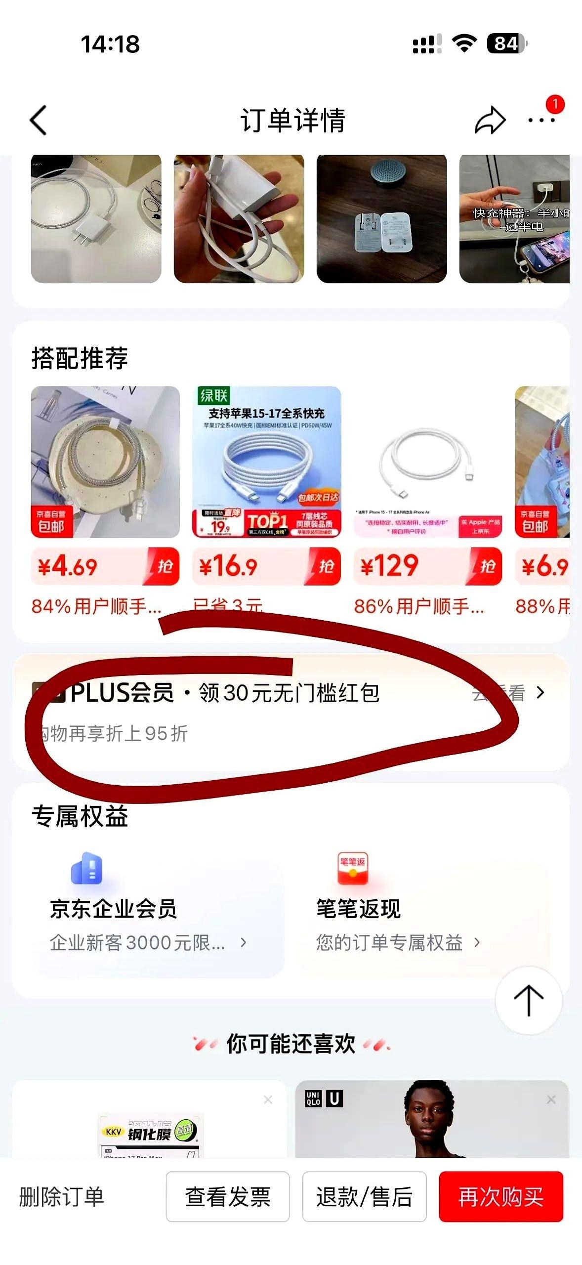 京东Plus会员灯一灭,续费页面立马弹出来,上面就俩字:10块。 我当时就把手机往桌上一扣。用了一整年,临了就给我这个?不续了。 可这口气就是咽不下去。我随手点开一个上个月买猫砂的订单,就那么漫无目的地往下滑,指尖划过商品图,划过物流信息,划过一堆没用的推荐,一直拉,一直拉,拉到屏幕的最底端,都快没东西了。 突然,一行小字跳进眼睛里。 “续费Plus会员,领30-50元红包”。 我点进去,一个40块的红包直接砸我脸上。 这叫什么?这就叫你不去翻箱倒柜,它就真当你是傻子。