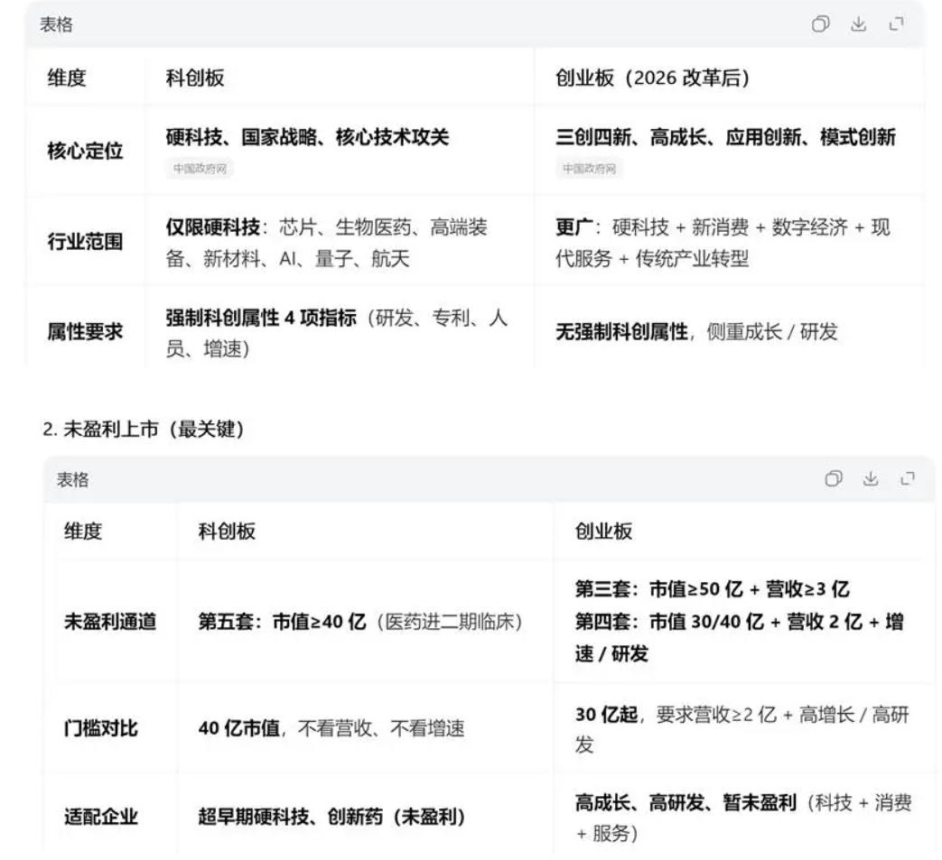 最近创业板迎来重磅改革,核心就是撕掉 “唯利润论”,全力服务新质生产力。 这次最关键的是增设第四套上市标准,专门面向高成长、高研发、暂未盈利的创新企业:一类面向新兴成长行业,市值不低于 30 亿、年收入≥2 亿、近 3 年营收增速≥30%;另一类面向硬核研发企业,市值≥40 亿、年收入≥2 亿、近 3 年累计研发≥1 亿且研发占比≥15%,精准覆盖 AI、生物医药、商业航天等赛道。 同时推行再融资储架发行,一次审批、多次发行,给科技企业融资大开方便之门。 官方定位上,科创板主攻硬科技攻关,创业板侧重应用创新与高成长,但界限明显模糊,背后也有沪深交易所、两大城市群的良性竞争。国家层面就是要通过市场化竞争,把科技创新和产业升级彻底卷起来。