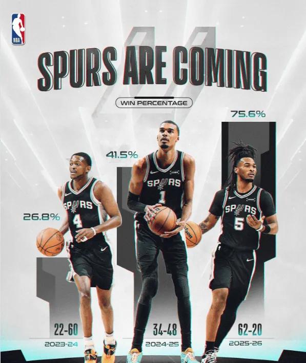 隔壁的火箭馋哭了。谁都知道马刺能崛起,但是谁都不知道马刺崛起只用了3个赛季,一个文班,一个卡斯尔,一个哈柏,连续三年三个选秀,华丽转身的速度太快了。 2023-24赛季:文班元年,马刺最终 22胜60负。 2024-25赛季:卡斯尔元年,马刺最终 34胜48负。比上赛季多赢12场! 2025-26赛:哈柏元年,马刺最终 62胜20负 ,比上赛季多赢28场!