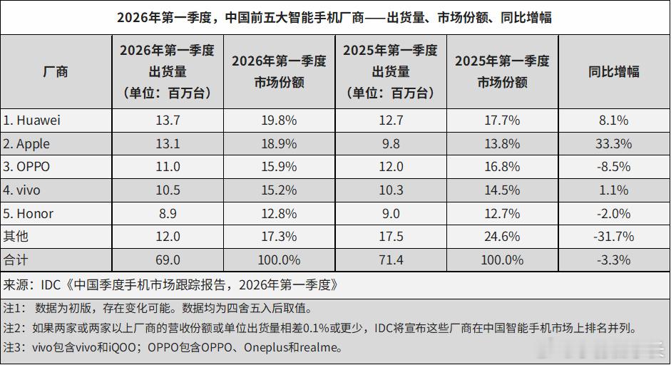 IDC数据,2025年第一季度,中国出货量前五的手机厂商分别是华为,苹果,OPPO,vivo和荣耀。