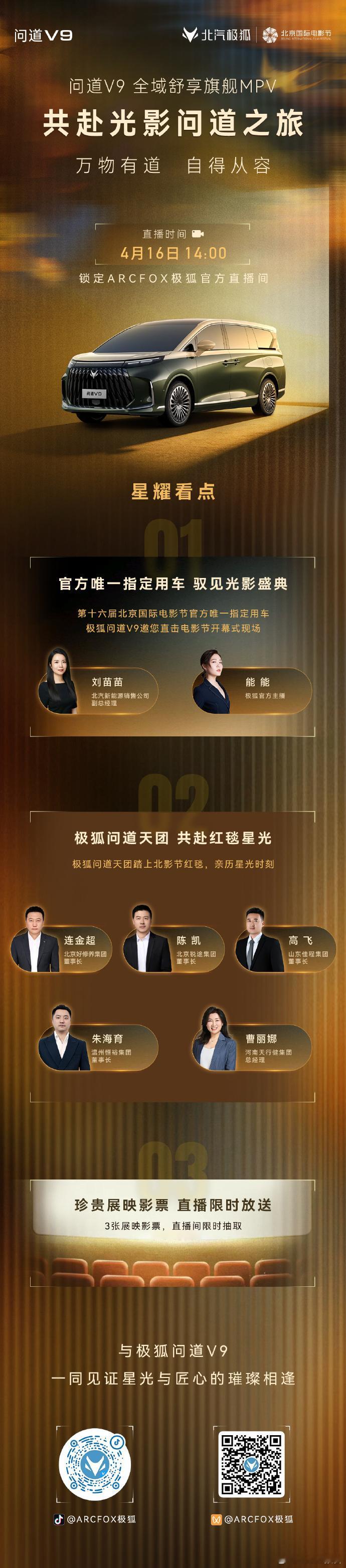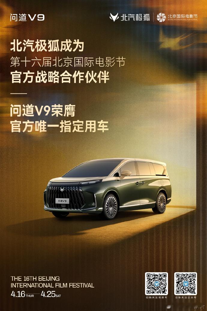 极狐问道V9闪耀北影节北汽极狐成为第十六届北京国际电影节官方战略合作伙伴,旗下问道V9为官方唯一指定用车,4月亮相红毯,以高端出行礼遇光影盛宴,彰显品牌旗舰格调。