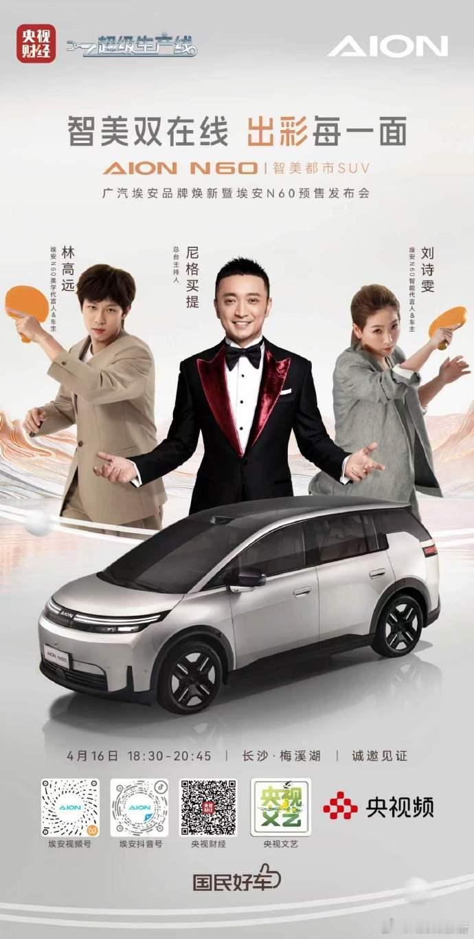 埃安N60预售发布会定于4月16日18:30在长沙梅溪湖举办,由央视主持人尼格买提主持。品牌邀请乒坛双星、担任代言人,现场还将有TES.A战队、解说大咖助阵,并打造拉斯维加斯Sphere同款巨型球场景,以时尚大秀形式亮相,车型标配零重力座椅,看点十足。林高远刘诗雯合体代言埃安N60埃安N60智美时尚大秀定档416埃安N60带你躺赢超神埃安N60预售定档416