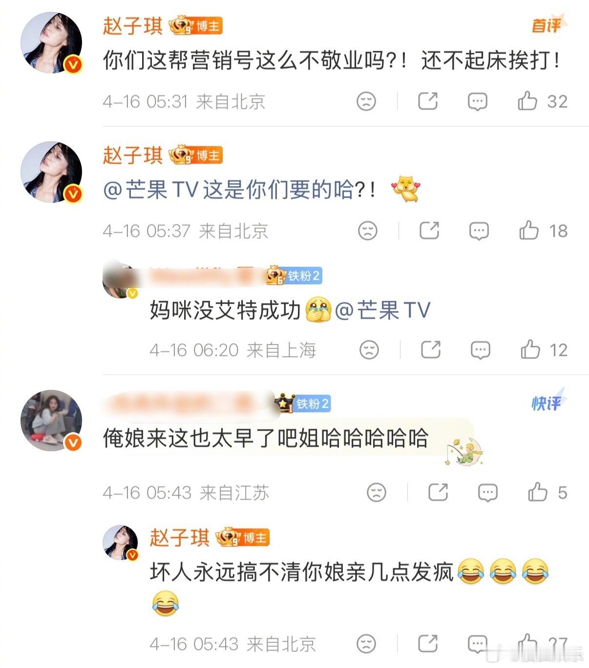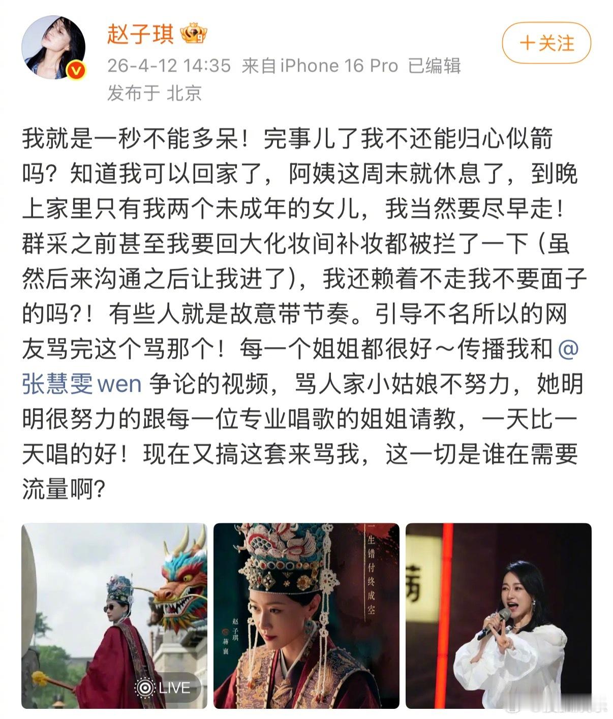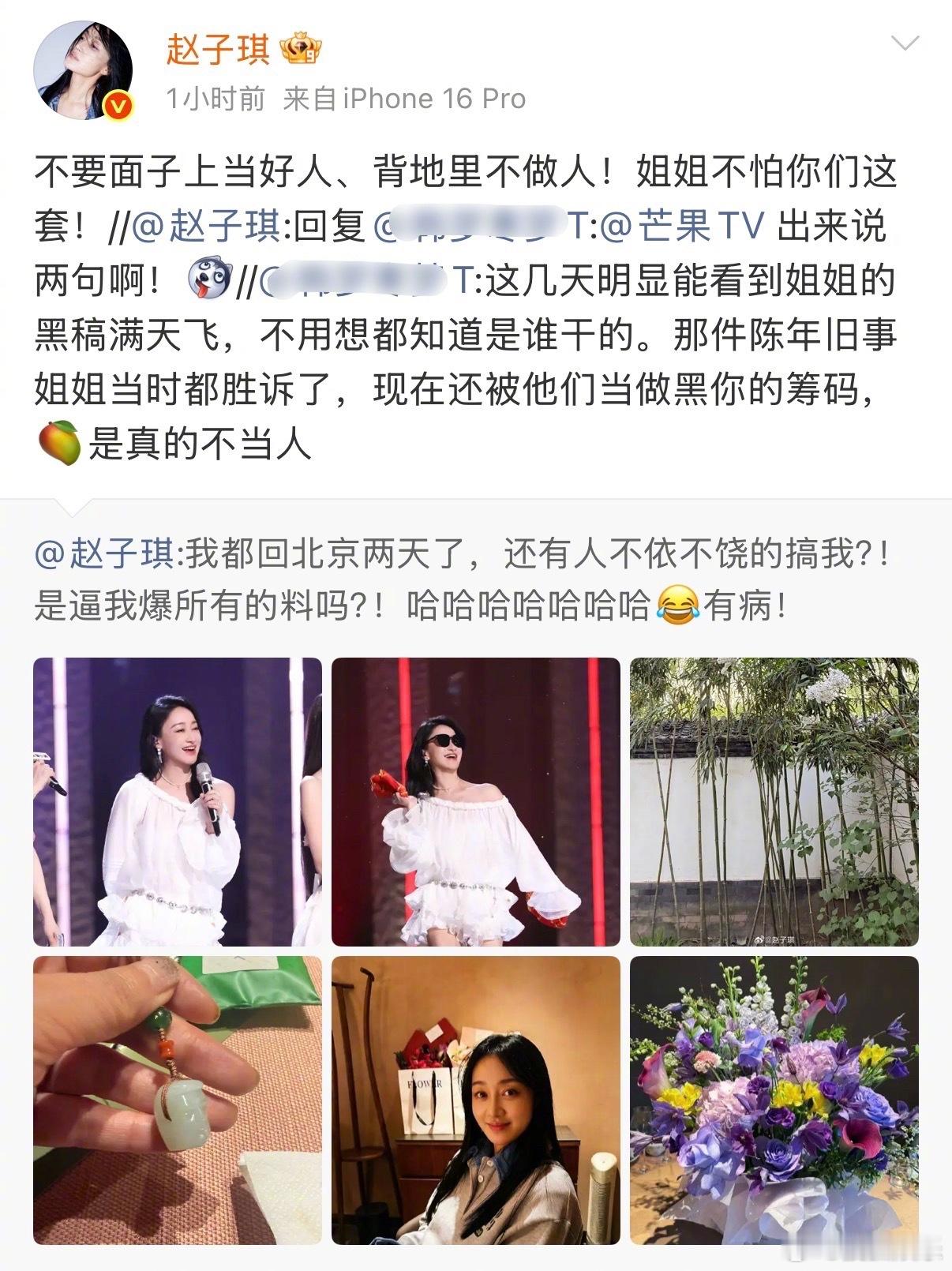 赵子琪 是逼我爆所有的料吗 赵子琪今天一早开撕芒果:“都出来说说,我跟慧雯吵架的视频是怎么被你们剪辑出来的!” 并表示有人不依不饶地搞她,“是逼我爆所有的料吗?”
