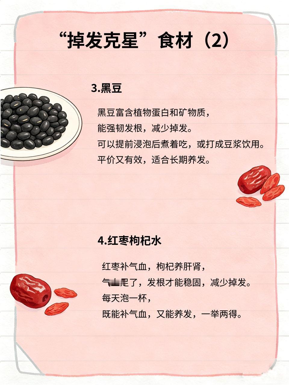 掉发克星!每天吃一点,发根稳了发量多了 掉发越来越年轻化👩🦰,熬夜、压力大、气血不足,都容易导致掉发、发根松动,发量越来越少。分享4种“掉发克星”食材🥜,每天吃一点,不用花钱养发,发根稳了,发量也会慢慢变多。 1.黑芝麻🖤 2.核桃🌰 3.黑豆🫘 4.红枣枸杞水🍵 掉发调理需要长期坚持,除了吃这4种食材,还要避免熬夜、减少压力,少染烫头发,慢慢就能看到效果,发根稳了,发量也会越来越多~