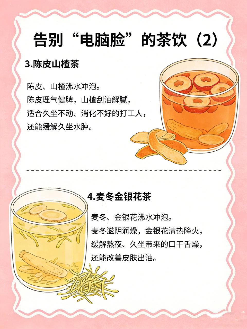 打工人续命茶!办公室4款茶饮,告别电脑脸 打工人每天久坐电脑前💻,长时间面对屏幕,容易出现眼睛干涩、脸色暗沉、皮肤出油、疲惫乏力等问题,被称为“电脑脸”🖥。分享4款办公室续命茶🍵,做法简单,随手冲泡,帮你告别电脑脸,缓解疲劳。 1.枸杞菊花茶🌸 2.玫瑰红枣茶🌹 3.陈皮山楂茶🍒 4.麦冬金银花茶🌼 打工人不用特意花费时间,办公间隙泡一杯,既能缓解疲劳、保护眼睛,又能改善气色,告别电脑脸,轻松开启养生办公模式~