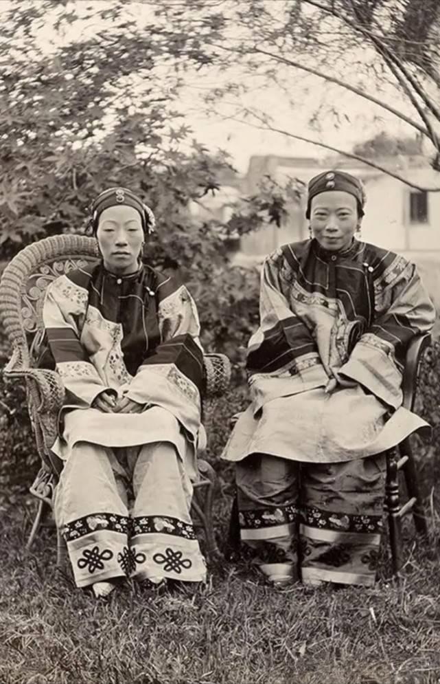 晚清,这张照片将两位汉族士绅家庭女性的身影,永远留在了庭院的树影天光里。 右侧的女性面对镜头时相对放松的浅微笑,是晚清人像中少见的放松状态,左侧的女性脸部严肃,这是因为早期湿版摄影曝光时间长达数秒至数十秒,被摄者必须全程保持绝对静止,否则照片会模糊,因此绝大多数晚清人像都是严肃、紧绷的表情。