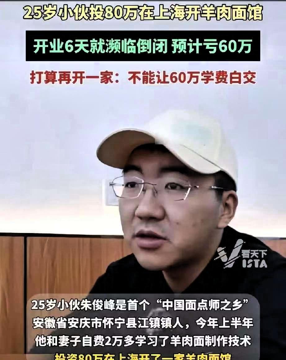 安徽,小伙在上海开了家羊肉面馆,结果开业6天就濒临倒闭,预计亏损60-70万,就在面馆倒闭后不久,他又做出一个惊人的决定,再投40万开一家新店,再穷也要当老板 来自安徽安庆“中国面点师之乡”的小伙朱峻锋原本跟随父母经营早点生意,想尝试新的创业方向,便花费万元学习羊肉面技术,与合伙人凑齐80万元资金,在上海杨浦区选址开店。他看中了当地的人流量,却忽视了每月9万元的高额租金,前期仅房租就支出45万元,再加上装修、设备、原料等费用,资金迅速投入到位。 试营业免费体验时客流尚可,可正式开业后,生意远不及预期,每日营业额难以覆盖房租、人工等成本,即便24小时经营,也无法扭转亏损局面,最终只能选择关店。创业失败带来的经济压力,也让他的婚姻受到影响,遭遇了事业与家庭的双重挫折。 即便如此,朱峻锋并没有放弃,他决定再投入40万元,重新开设羊肉面馆,希望能弥补之前的损失,总结经验再次创业。他这份不服输的心态值得肯定,但也暴露出年轻创业者容易出现的问题。 当下不少人觉得餐饮行业门槛较低,容易上手,便在没有做好充分市场调研、成本核算的情况下,盲目投入创业。忽略行业运营规律,仅凭一腔热情,很容易面临经营风险。 创业本就不是易事,敢闯敢拼的精神固然重要,但更离不开前期的理性规划、对行业的深入了解以及对风险的合理把控。盲目投入只会增加创业失败的概率,只有脚踏实地,找准问题、规避风险,才能提高创业成功的可能性。