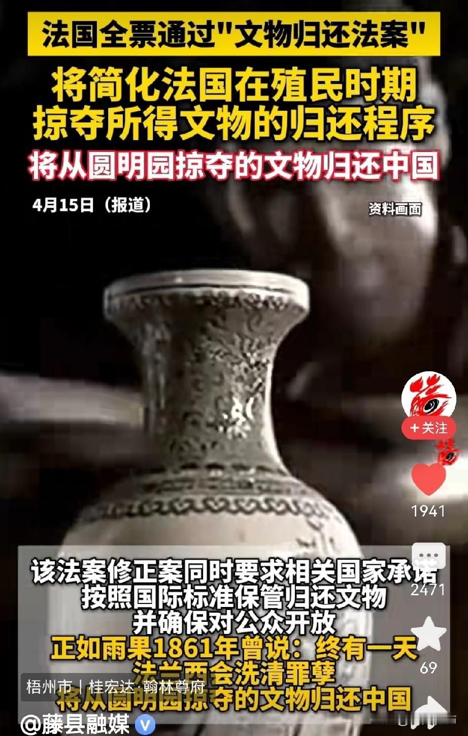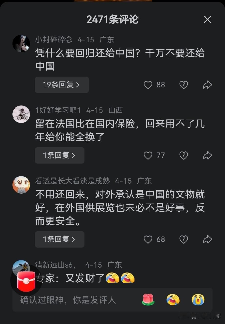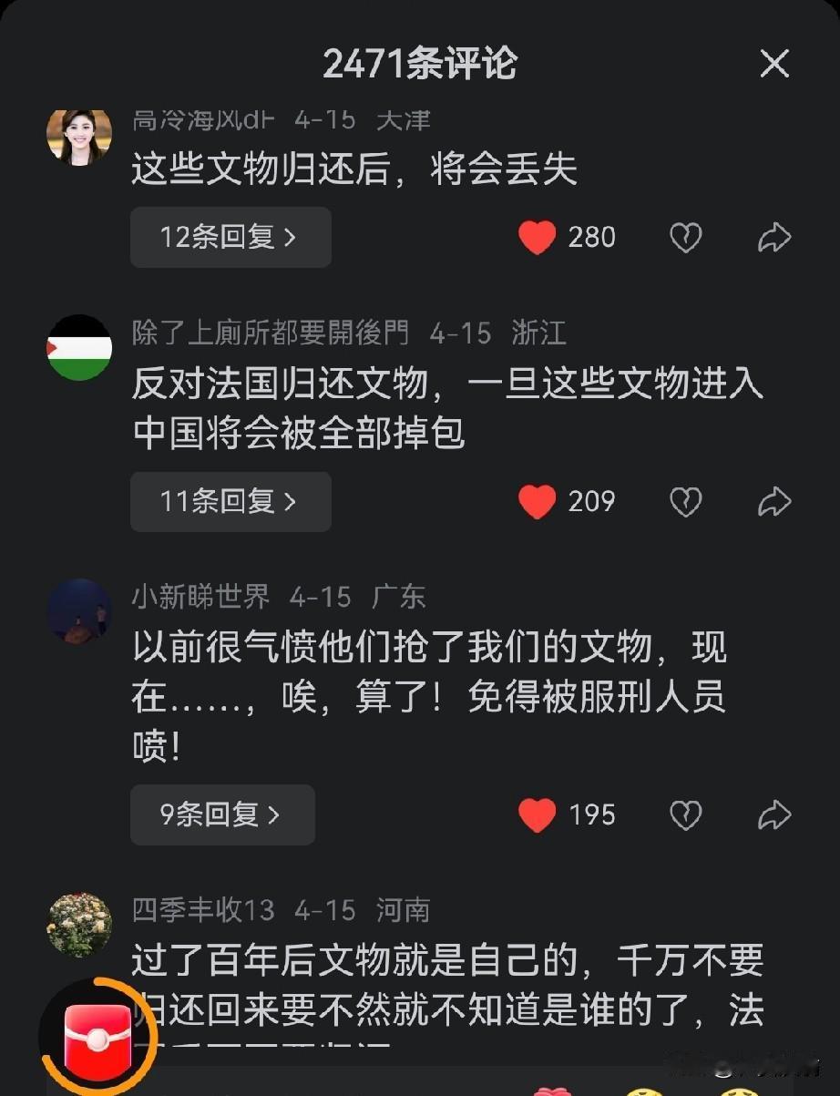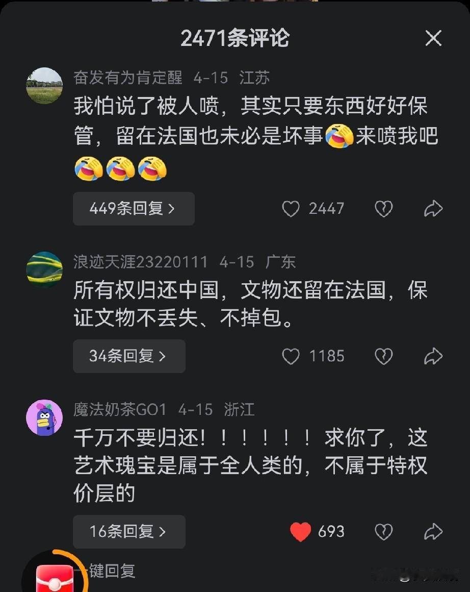 4月15日,法国全票通过了《文物归还法》,这意味着在法国殖民时期从其他国家掠夺的文物将归还给这些国家。当然也包括八国联军侵略中国时,抢劫圆明园的文物归还中国。这本是令人庆贺的事。但视频的评论区却让人大跌眼镜! 评论区大多数评论都不希望法国归还中国。有人希望继续留在法国,至少能得到很好的保护。有人甚至说文物属于全世界,不属于中国的特权阶层。看了这些评论,真让人感到悲哀,看来南京文物案给中国百姓心里带来了多么严重的阴影与伤害。