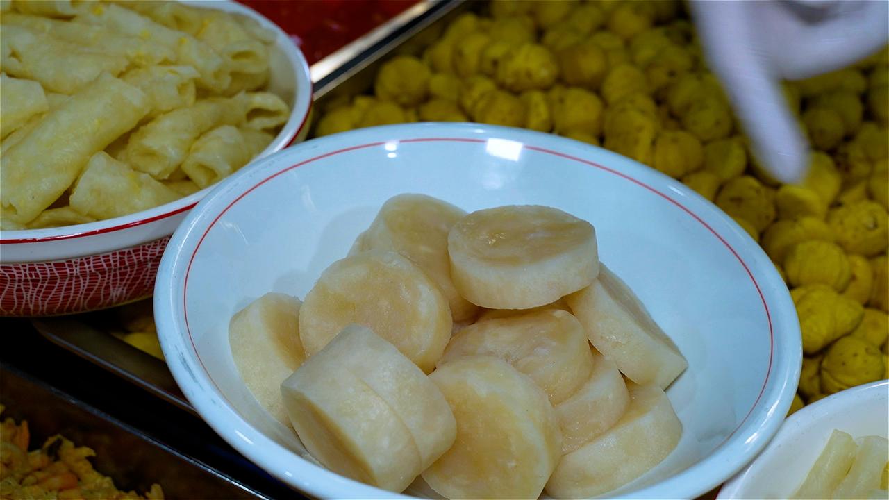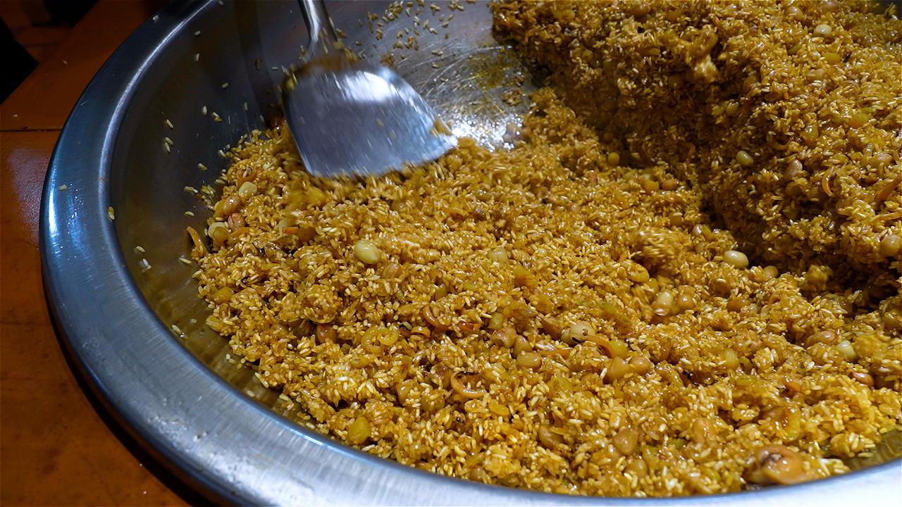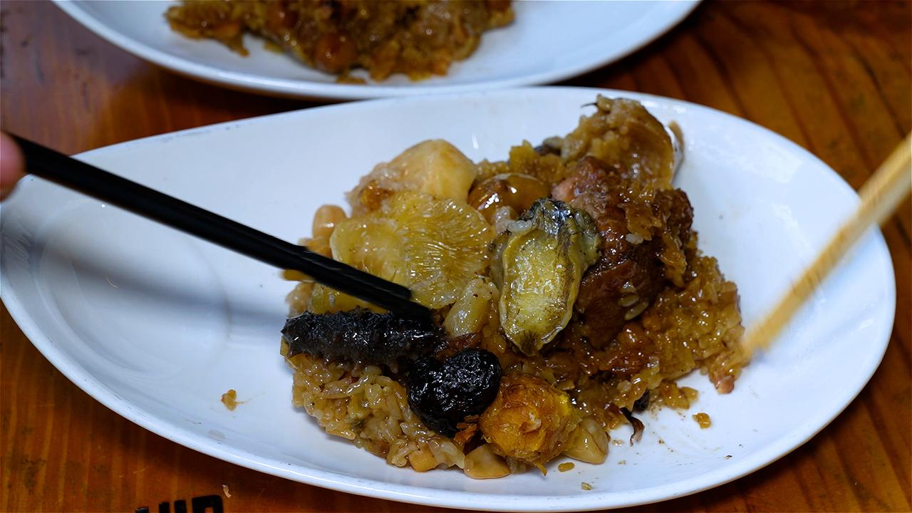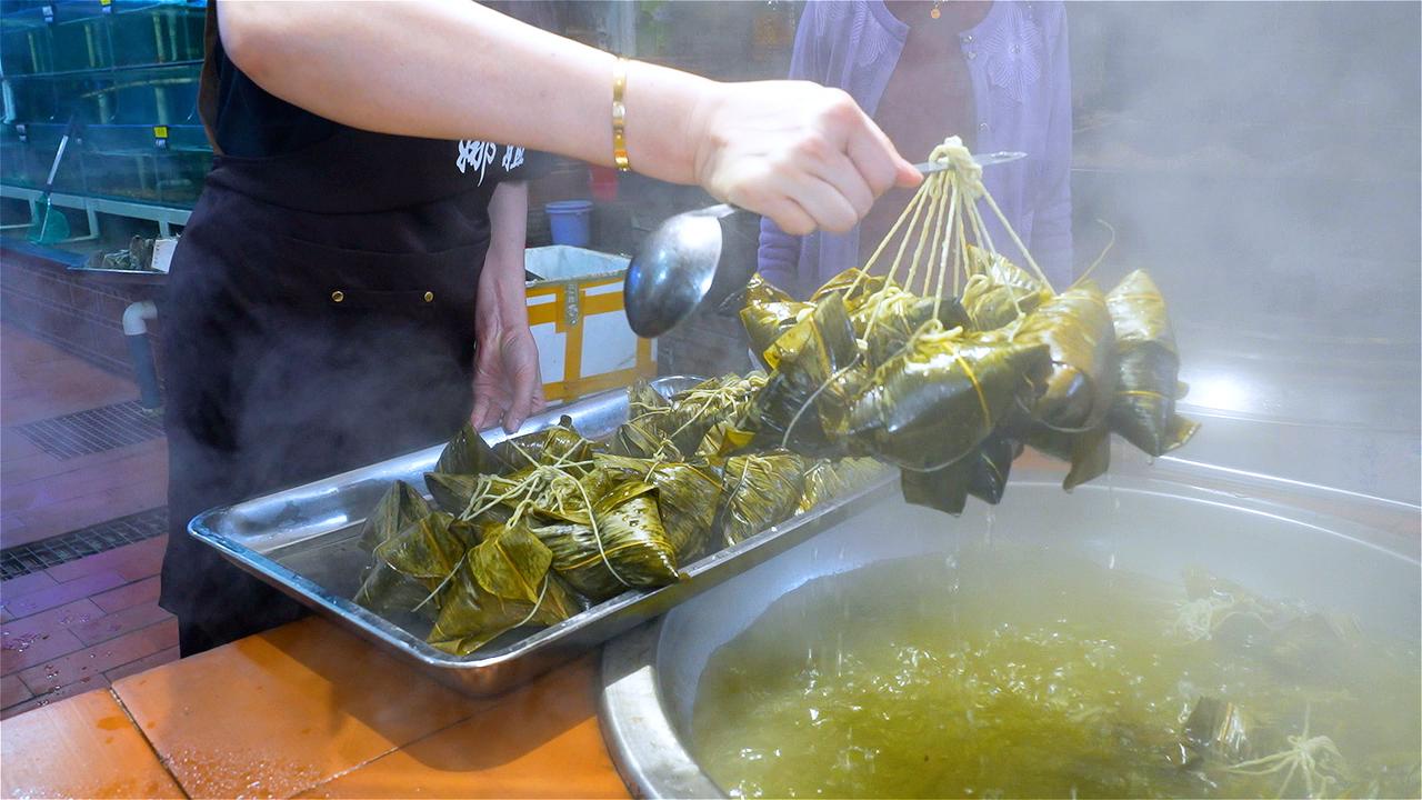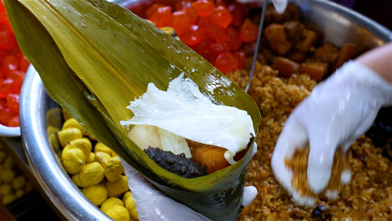 阿嬷用料极为考究,鱼翅、海参、鱼胶、澳带、鲍鱼等山珍海味多达15种,海鲜分量甚至超过了糯米。她先将干贝、虾米、香菇等配料用文火油炸,逼出浓郁香气,再下锅与糯米同炒,让每一粒米都裹上海鲜的精华。高峰时,阿嬷一天要炒整整30锅米。 炒好的米与丰富馅料一同包入粽叶,慢炖三小时。出锅瞬间,粽香四溢。入口软糯中带着层次分明的鲜香,鱼翅滑润,鲍鱼弹牙,海参与鱼胶软糯醇厚——每口都是大海与山珍的深情相拥。这不仅是一颗粽子,更是阿嬷三代人用半个多世纪守候的味觉记忆。