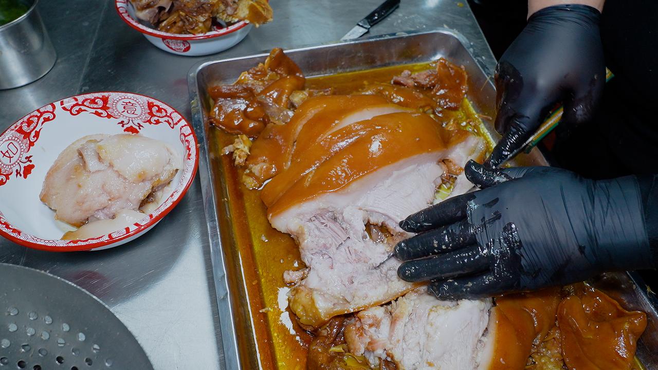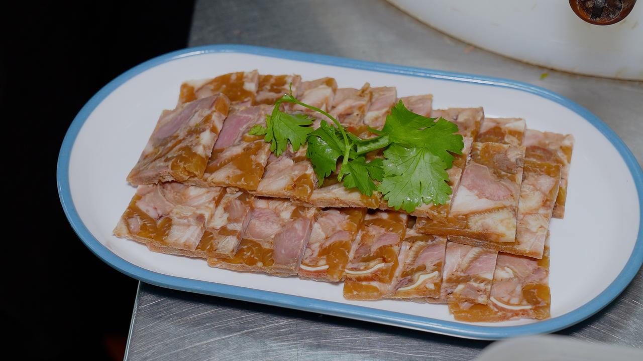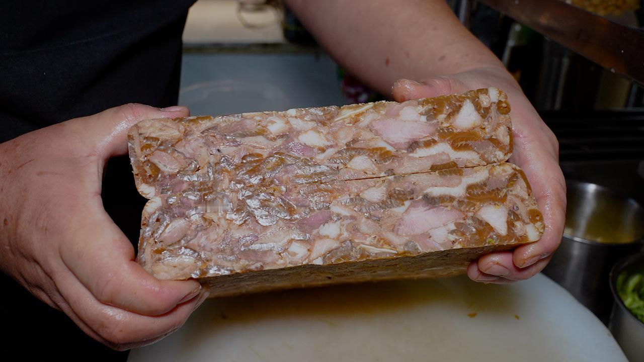 要做出地道的焖子,过程极其繁琐。一位有着二十多年经验的大厨,一天最多也只能精心制作一个猪头的量。清晨,整只猪头需经烈火喷烧去尽细毛,再仔细刮洗至皮色金黄,随后投入老汤中慢卤八个时辰。时光流转间,汤汁的醇厚与肉香充分交融。 待猪头卤至酥烂脱骨,重头戏才刚开始。大厨趁热下手,将猪脸肉一丝一缕地从骨架上剥落。这时的肉已软烂至极,胶质丰厚,轻轻一撕便肉骨分离。拆下的肉块带着皮与筋,回锅加料翻炒,让每一寸纤维都吸饱香气。最后,将这滚烫的肉糜填入模具,压紧实后冷藏定型。 成型的猪头焖子,切片上桌,纹理间透着肉冻的晶莹。夹起一片,入口是Q弹与咸香的完美碰撞,猪头肉的醇厚在齿间化开。这不单是38元一份的美味,更是下酒下饭的绝配,承载着东北人待客时那份掏心窝子的热乎劲儿。