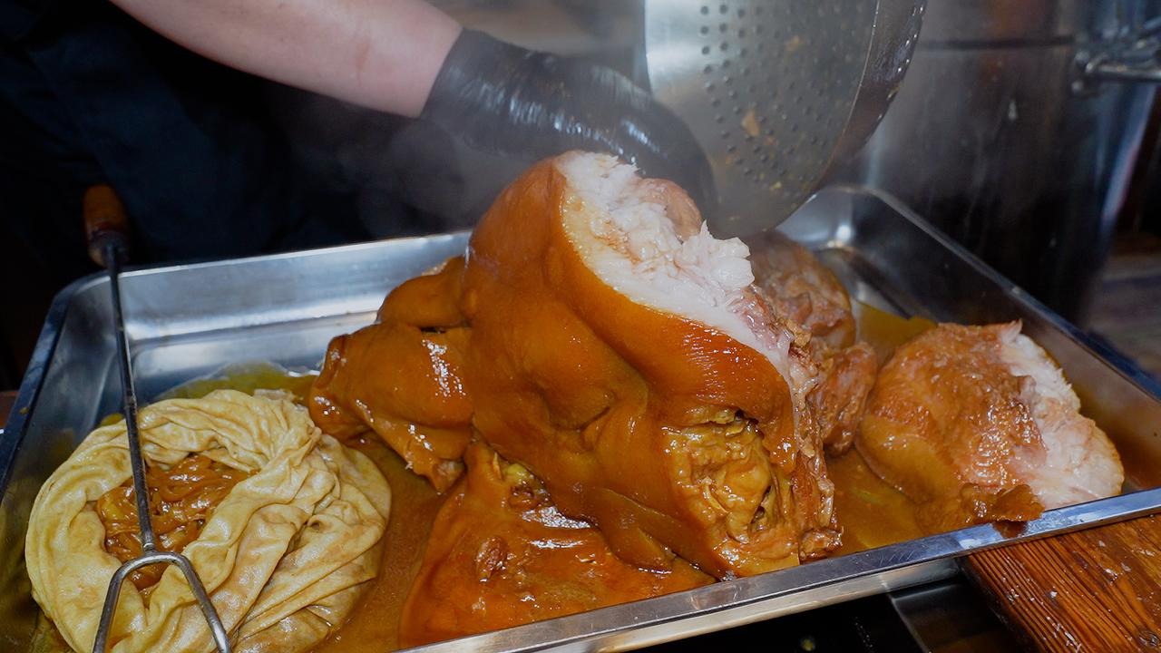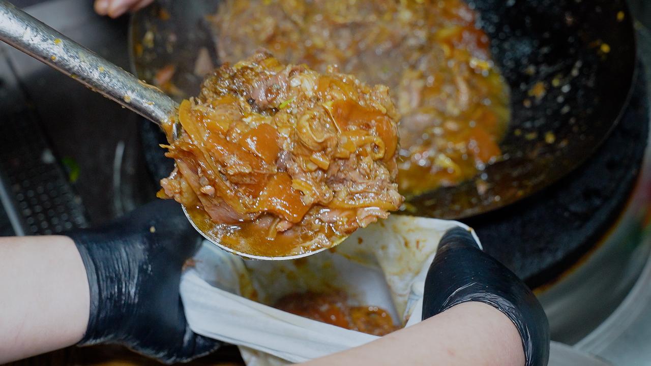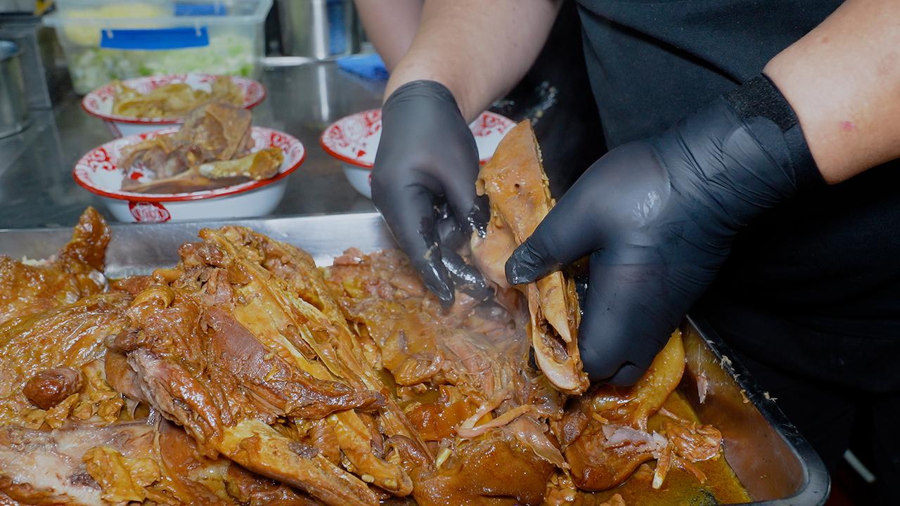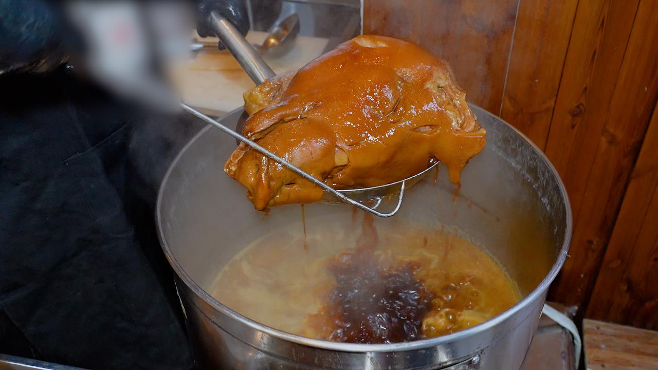 要做出地道的焖子,过程极其繁琐。一位有着二十多年经验的大厨,一天最多也只能精心制作一个猪头的量。清晨,整只猪头需经烈火喷烧去尽细毛,再仔细刮洗至皮色金黄,随后投入老汤中慢卤八个时辰。时光流转间,汤汁的醇厚与肉香充分交融。 待猪头卤至酥烂脱骨,重头戏才刚开始。大厨趁热下手,将猪脸肉一丝一缕地从骨架上剥落。这时的肉已软烂至极,胶质丰厚,轻轻一撕便肉骨分离。拆下的肉块带着皮与筋,回锅加料翻炒,让每一寸纤维都吸饱香气。最后,将这滚烫的肉糜填入模具,压紧实后冷藏定型。 成型的猪头焖子,切片上桌,纹理间透着肉冻的晶莹。夹起一片,入口是Q弹与咸香的完美碰撞,猪头肉的醇厚在齿间化开。这不单是38元一份的美味,更是下酒下饭的绝配,承载着东北人待客时那份掏心窝子的热乎劲儿。