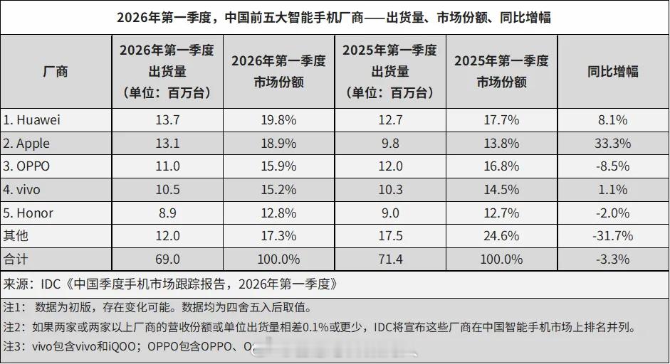 补一下IDC 26Q1中国智能手机市场数据。本季度第一名是华为(今年度不出意外年度冠军应该是华为)。