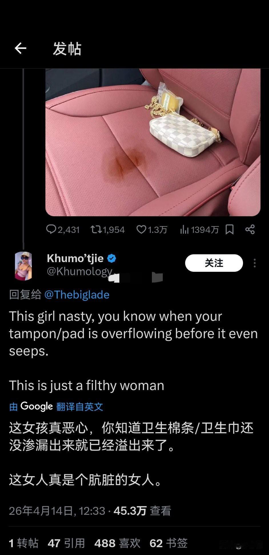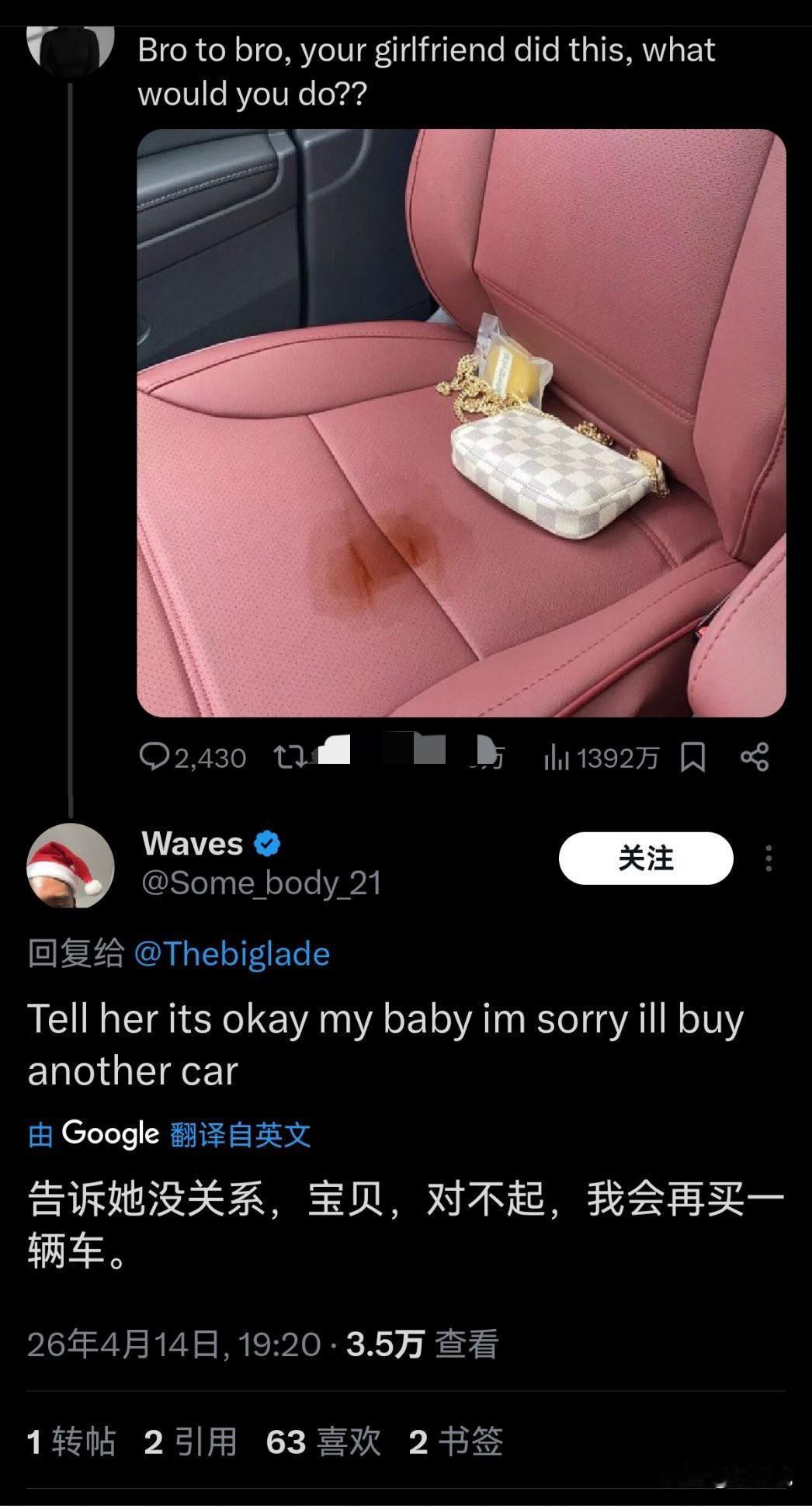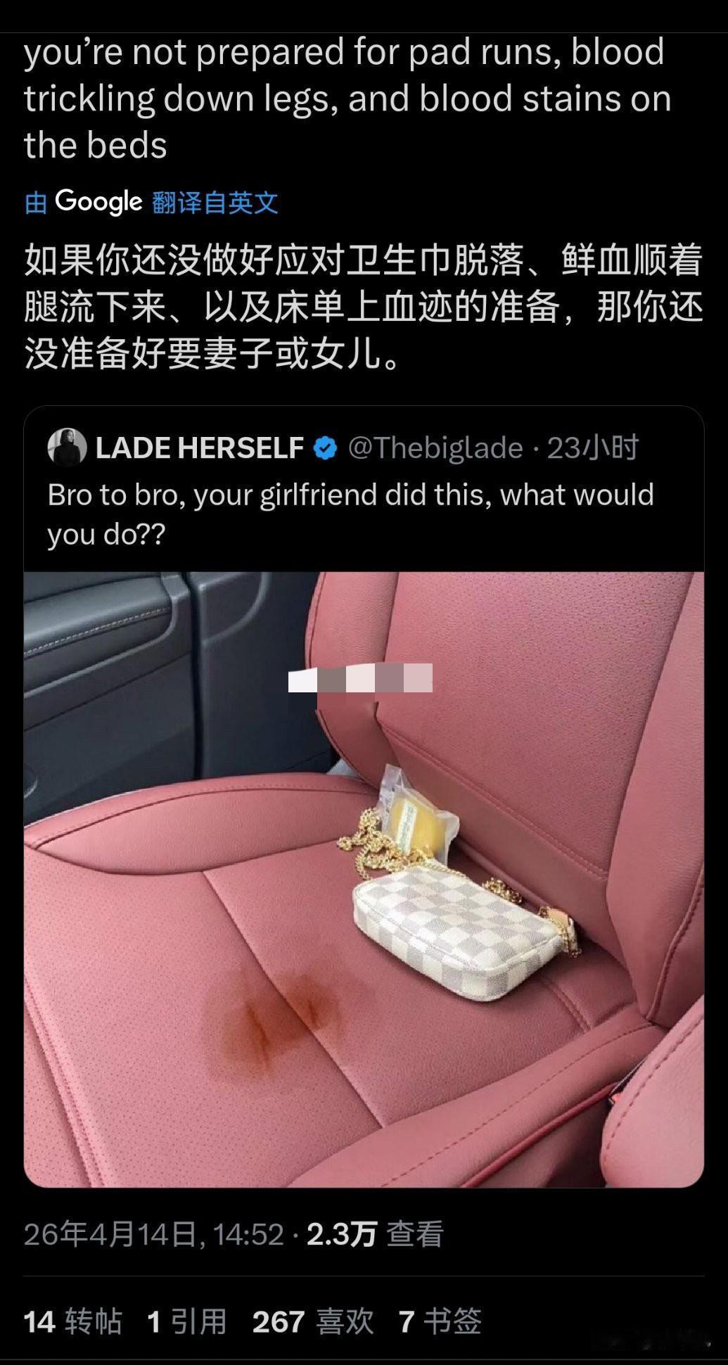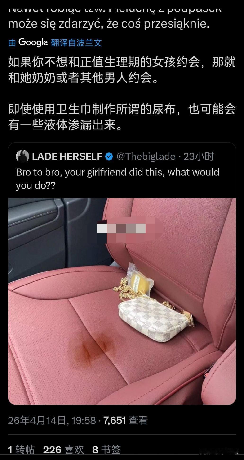 欧美一个车主网上求助,女朋友的月经弄脏了自己车的爱车,他问网友现在该怎么办? 我以为会是在问怎么清理……怎么DIY配比肥皂、洗洁精、洗衣液之类防止伤皮子或座椅。下面大家给的意见都是怎么对待女友,真是颠覆我对欧美的认知! 月经这东西不可控,你只能知道一个大概时间段,比如一个月满了,可能这两天来,也可能推后一星期来,也可能没满一个月提前就来,这是不能人为控制的! 这男的觉得脏可以找个男人约会,绝对没月经
