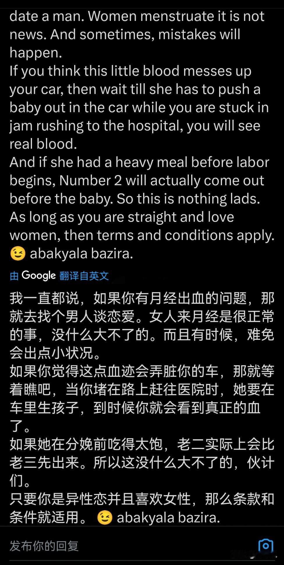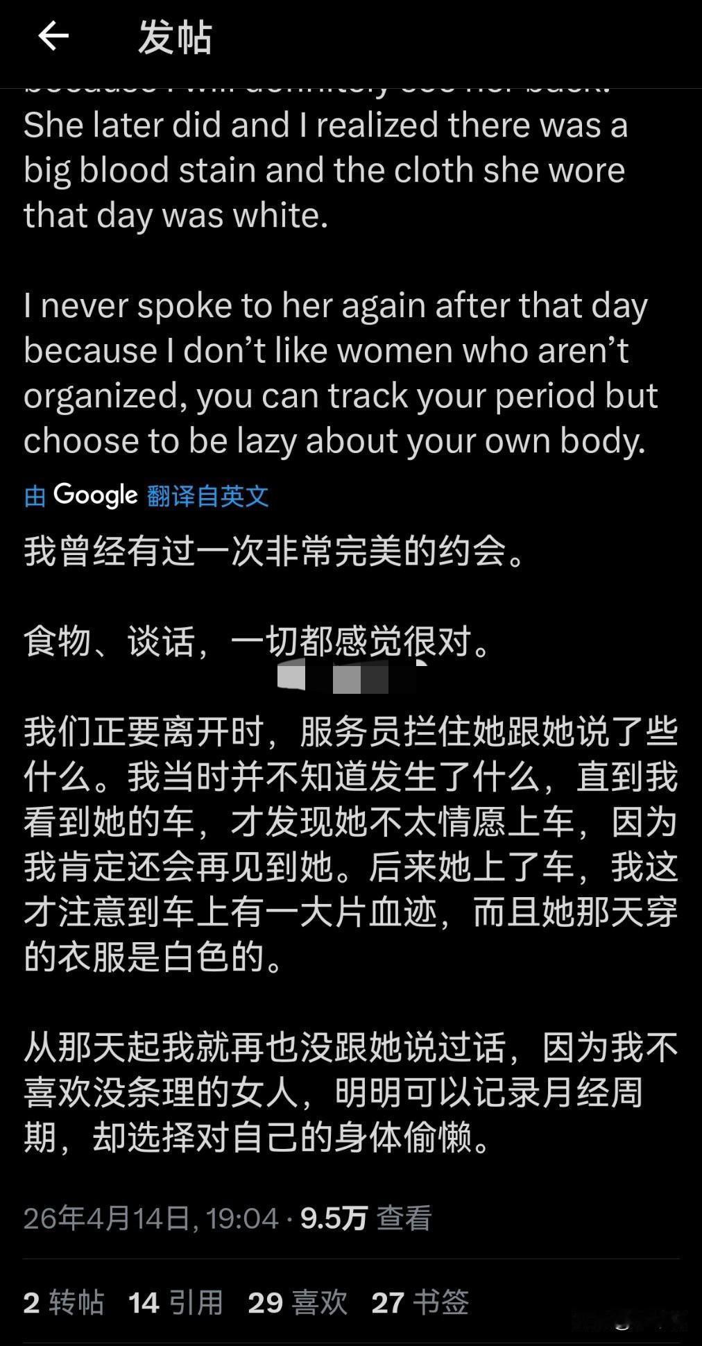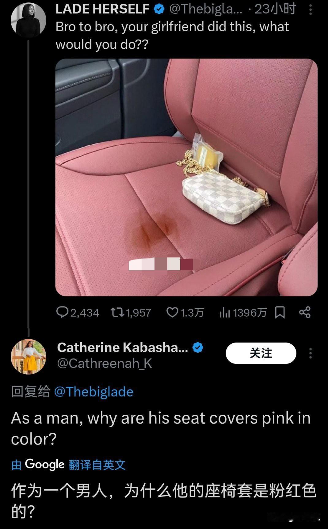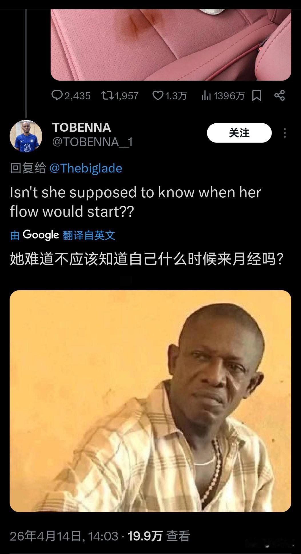 欧美一个车主网上求助,女朋友的月经弄脏了自己车的爱车,他问网友现在该怎么办? 我以为会是在问怎么清理……怎么DIY配比肥皂、洗洁精、洗衣液之类防止伤皮子或座椅。下面大家给的意见都是怎么对待女友,真是颠覆我对欧美的认知! 月经这东西不可控,你只能知道一个大概时间段,比如一个月满了,可能这两天来,也可能推后一星期来,也可能没满一个月提前就来,这是不能人为控制的! 这男的觉得脏可以找个男人约会,绝对没月经