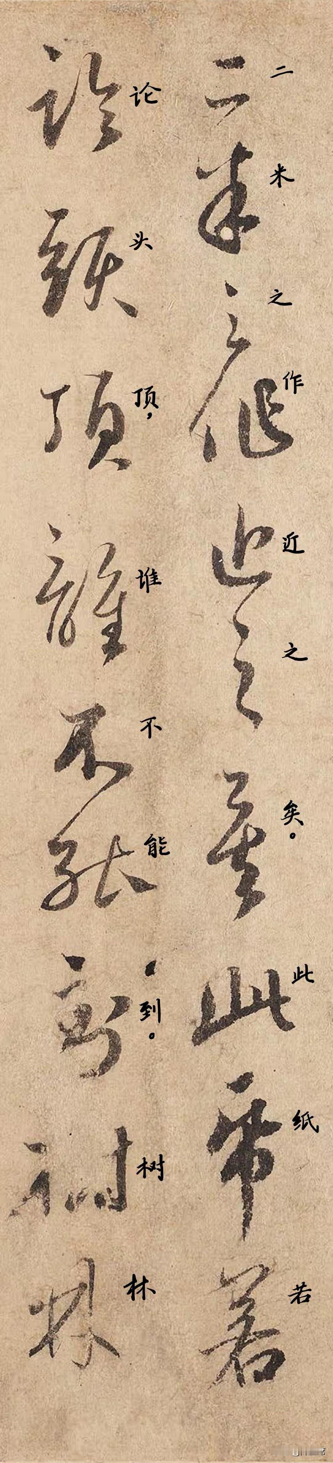 鲜于枢的草书作品和南宋米友仁的《云山图》卷题跋有着一段有趣故事。当时,这幅《云山图》卷可是艺术界的宝贝,鲜于枢看到后灵感大发,挥毫在上面题跋,留下了他的草书作品。 从书法上看,鲜于枢的草书那叫一个潇洒奔放。笔画粗细变化明显,粗处如重峦叠嶂,气势磅礴;细处似潺潺溪流,灵动婉转。他的笔锋运转自如,字与字之间连绵不断,仿佛一气呵成,展现出极高的艺术造诣。就像在纸上跳起了一支豪放的舞蹈,充满了生命力和节奏感,让人看了不禁为之赞叹。