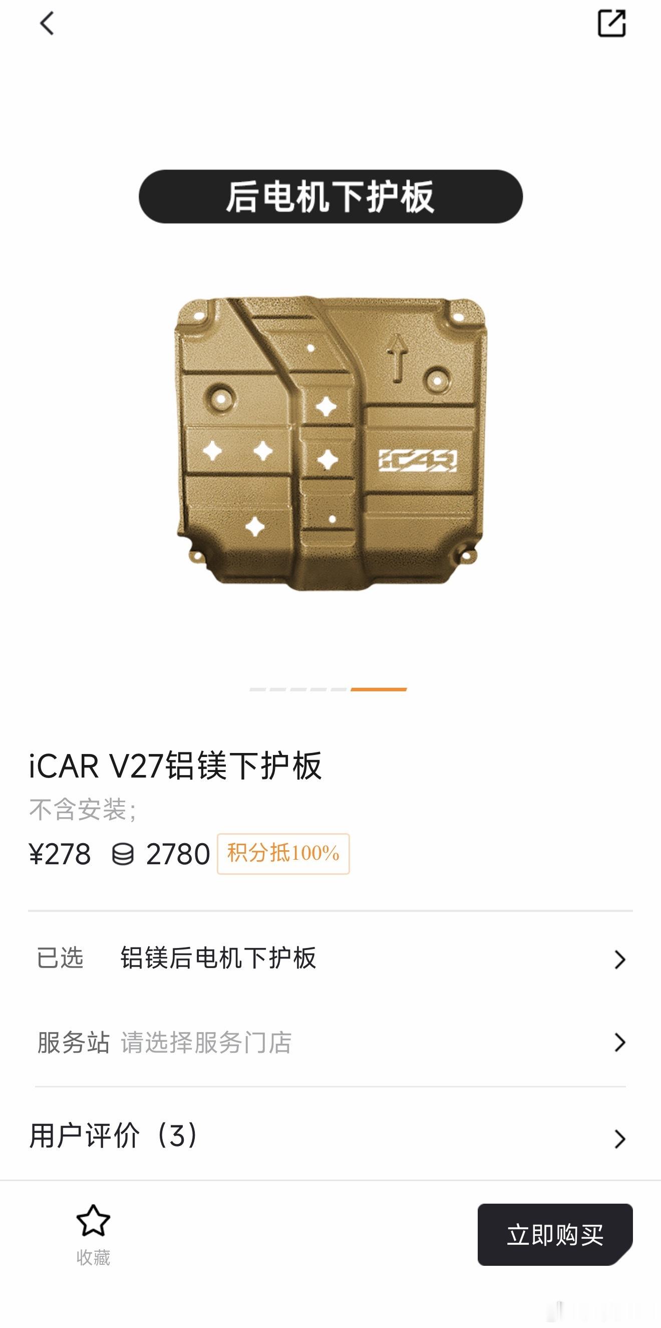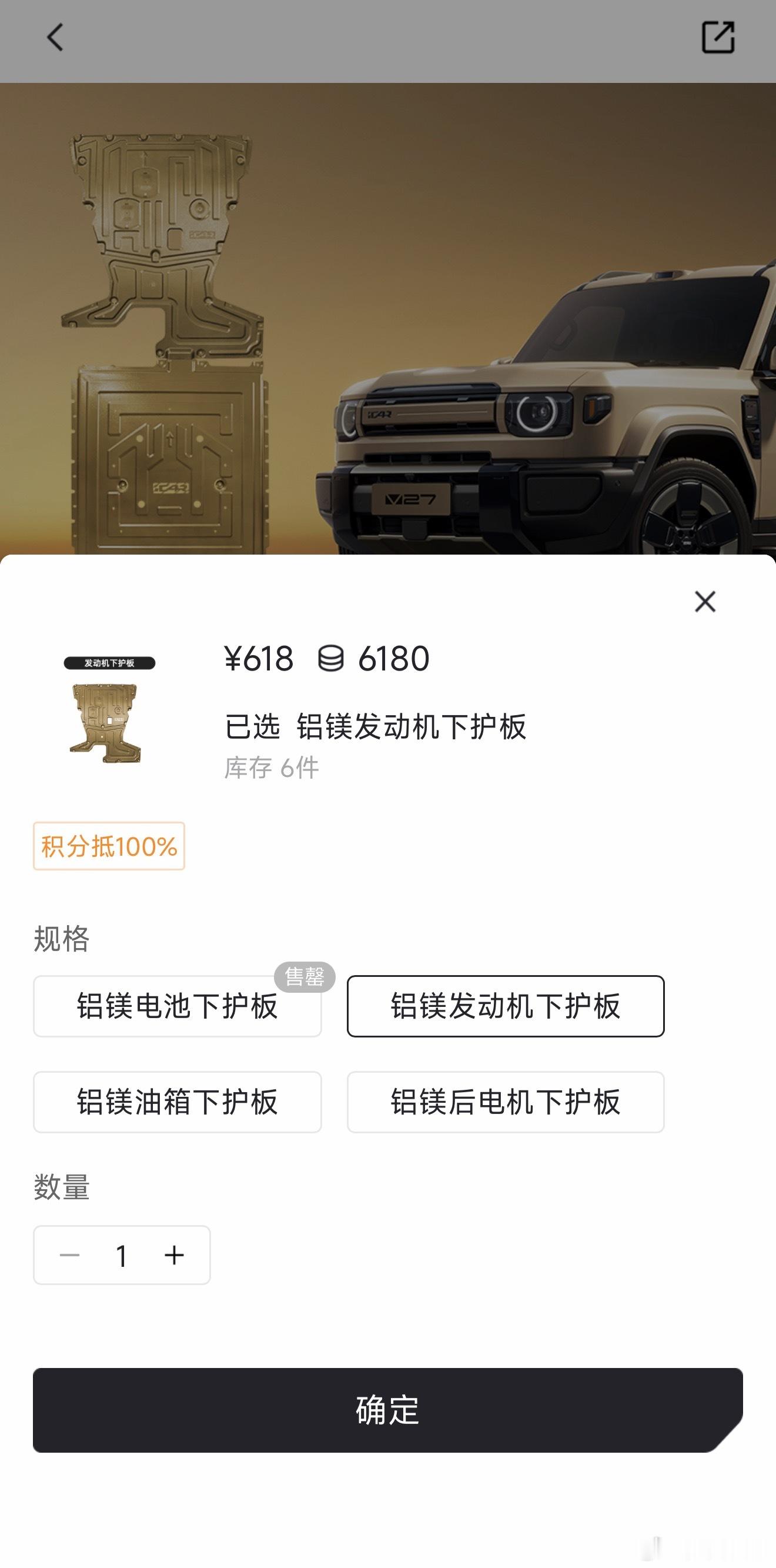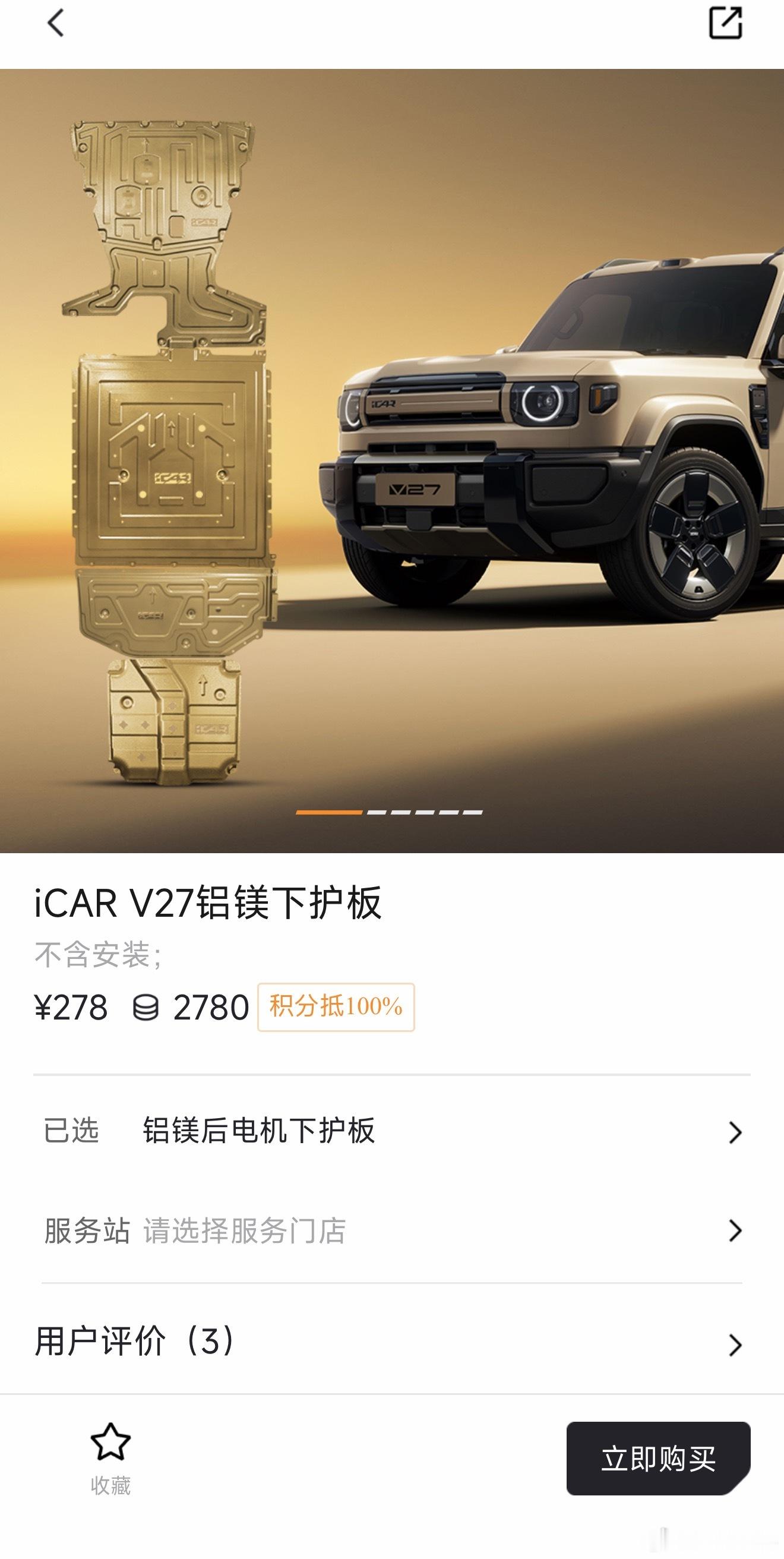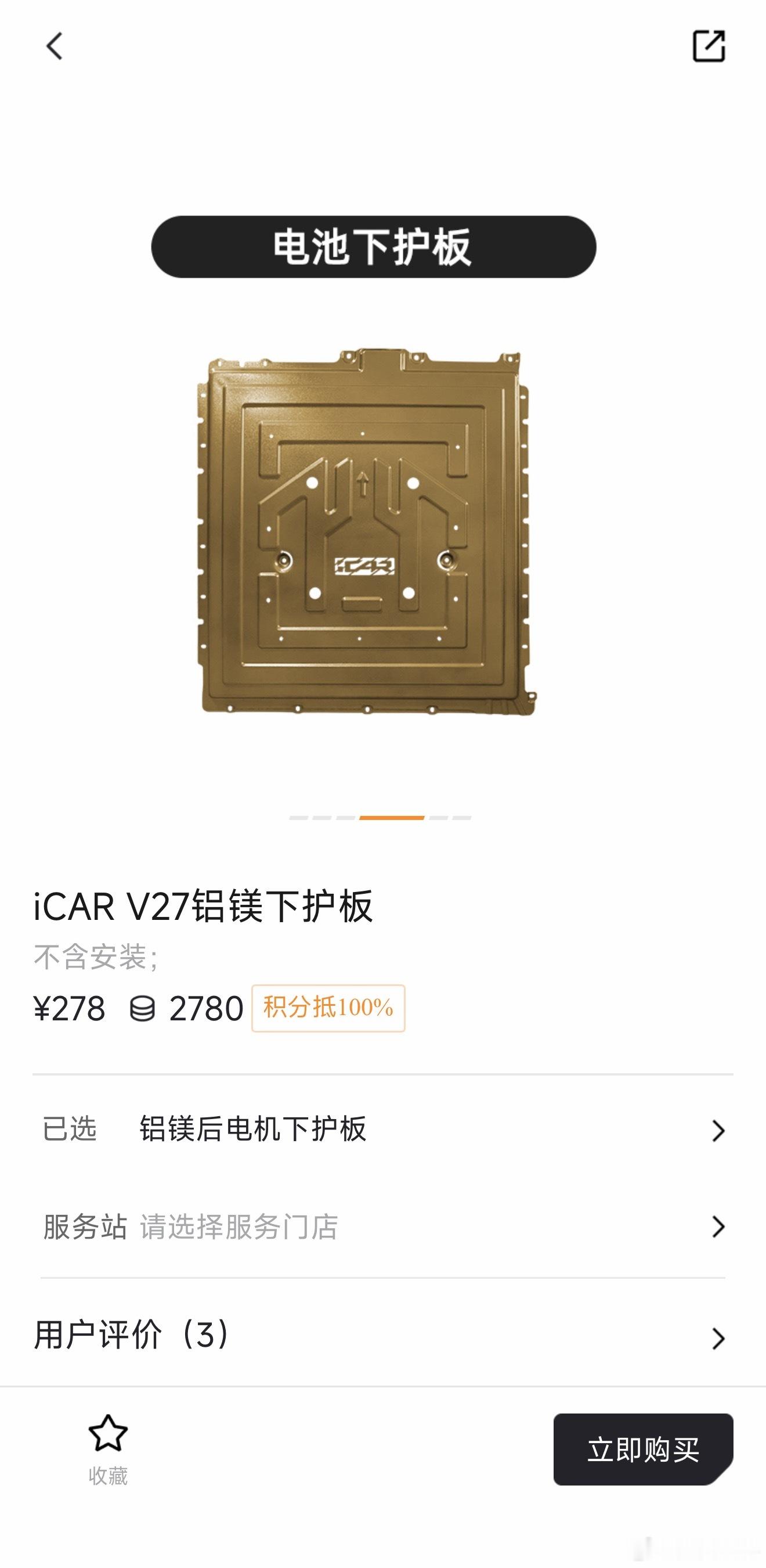 iCAR V27官方商城的配件,这个下护板套装不错,包含发动机/电池/油箱/后电机四块铝镁合金下护板,考虑的还挺到位,喜欢露营或自驾游拿买车积分换一套合适🙈