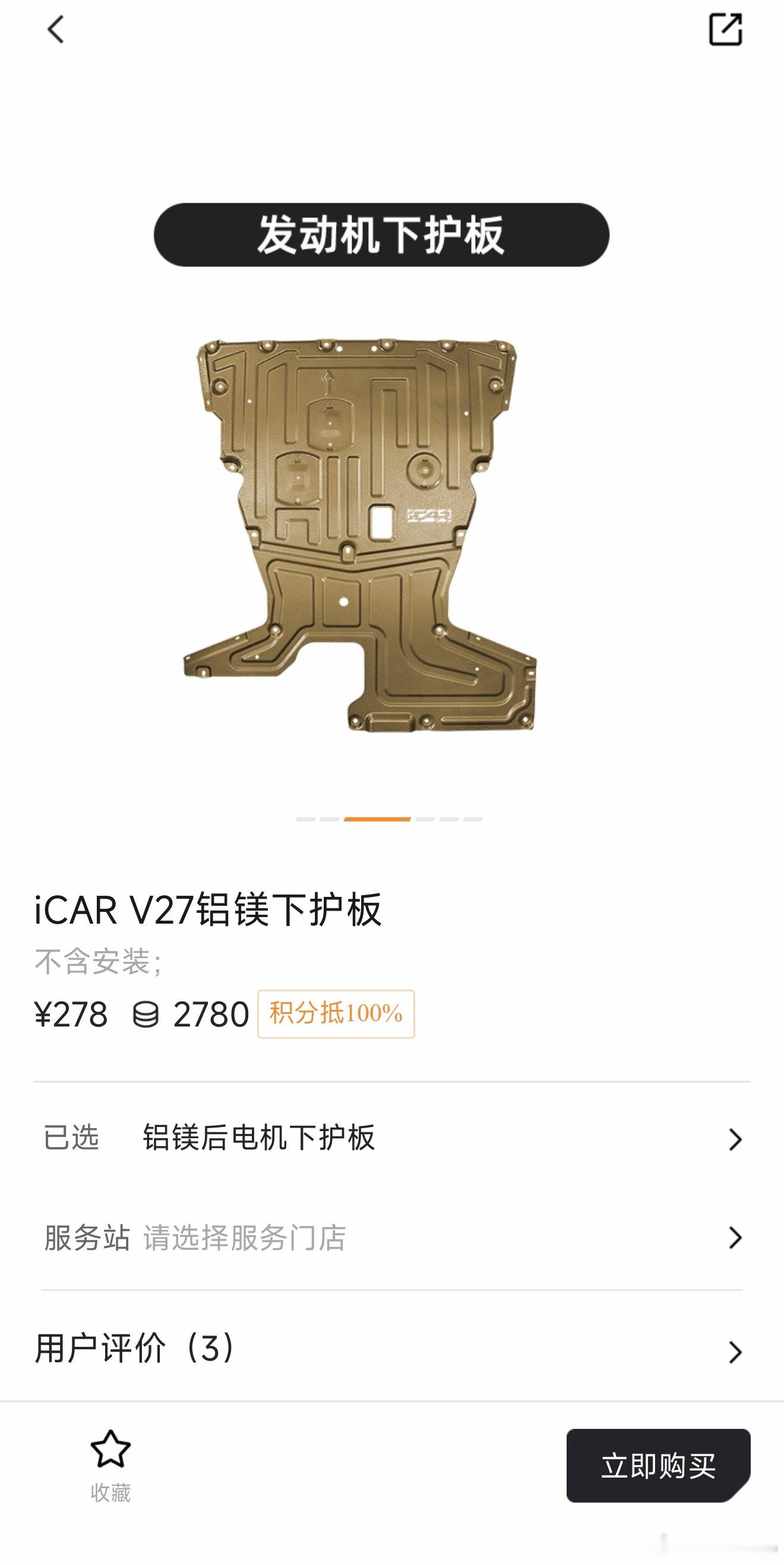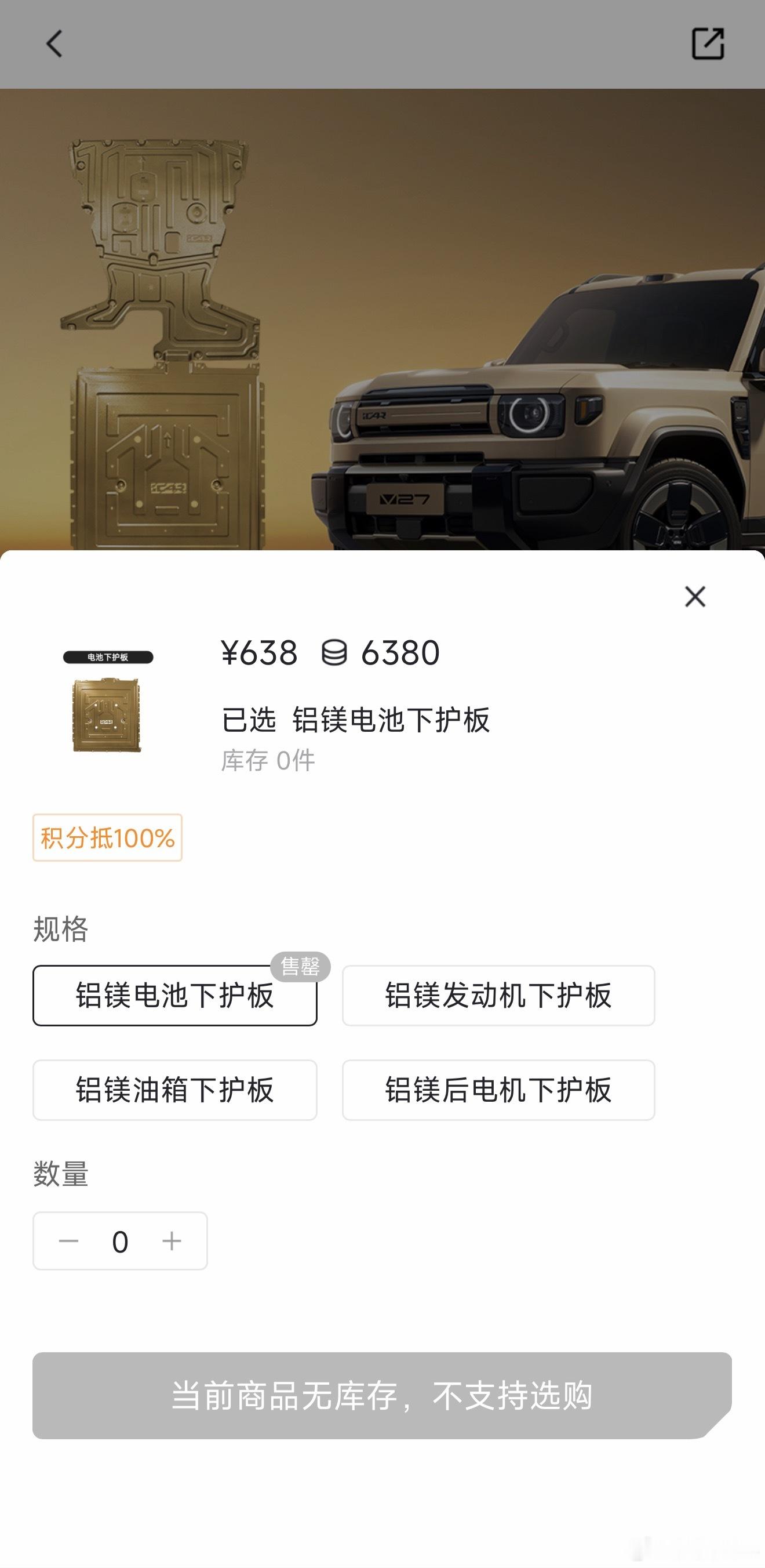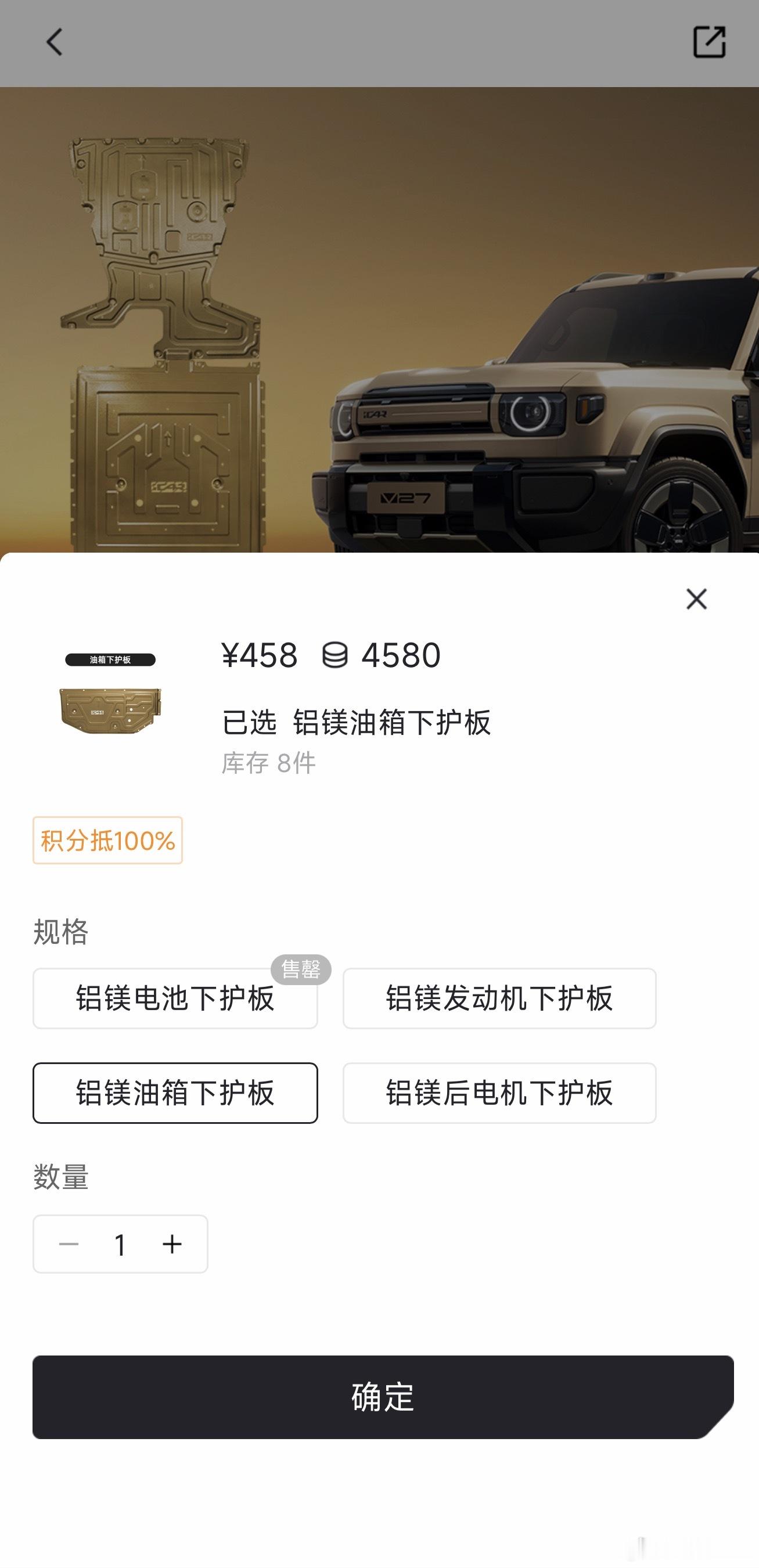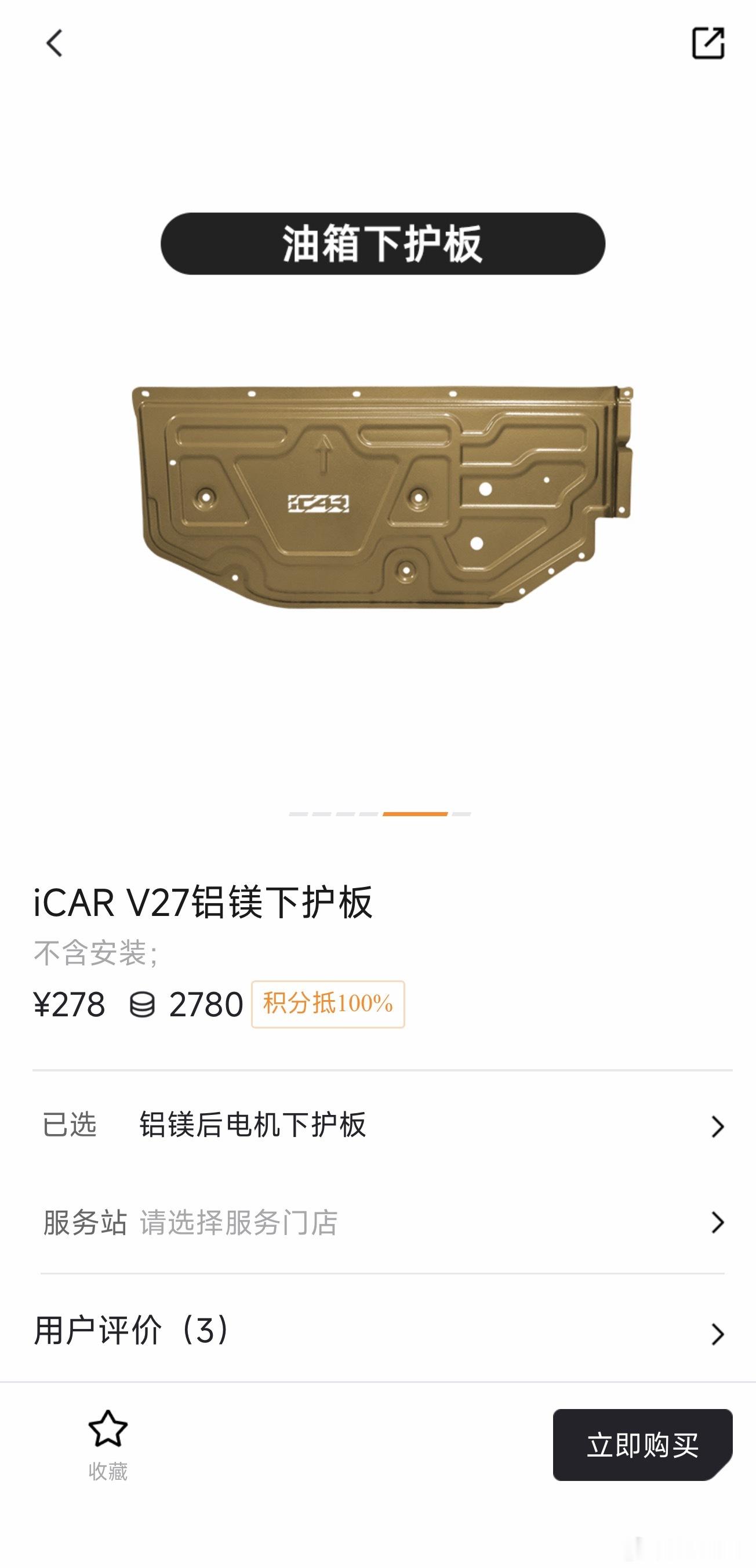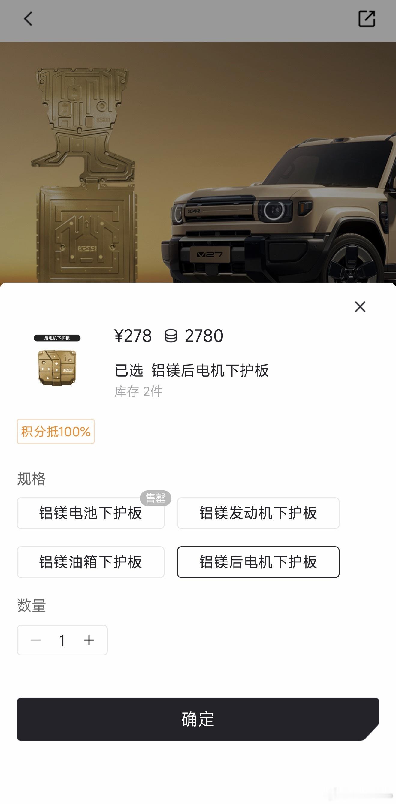 iCAR V27官方商城的配件,这个下护板套装不错,包含发动机/电池/油箱/后电机四块铝镁合金下护板,考虑的还挺到位,喜欢露营或自驾游拿买车积分换一套合适🙈