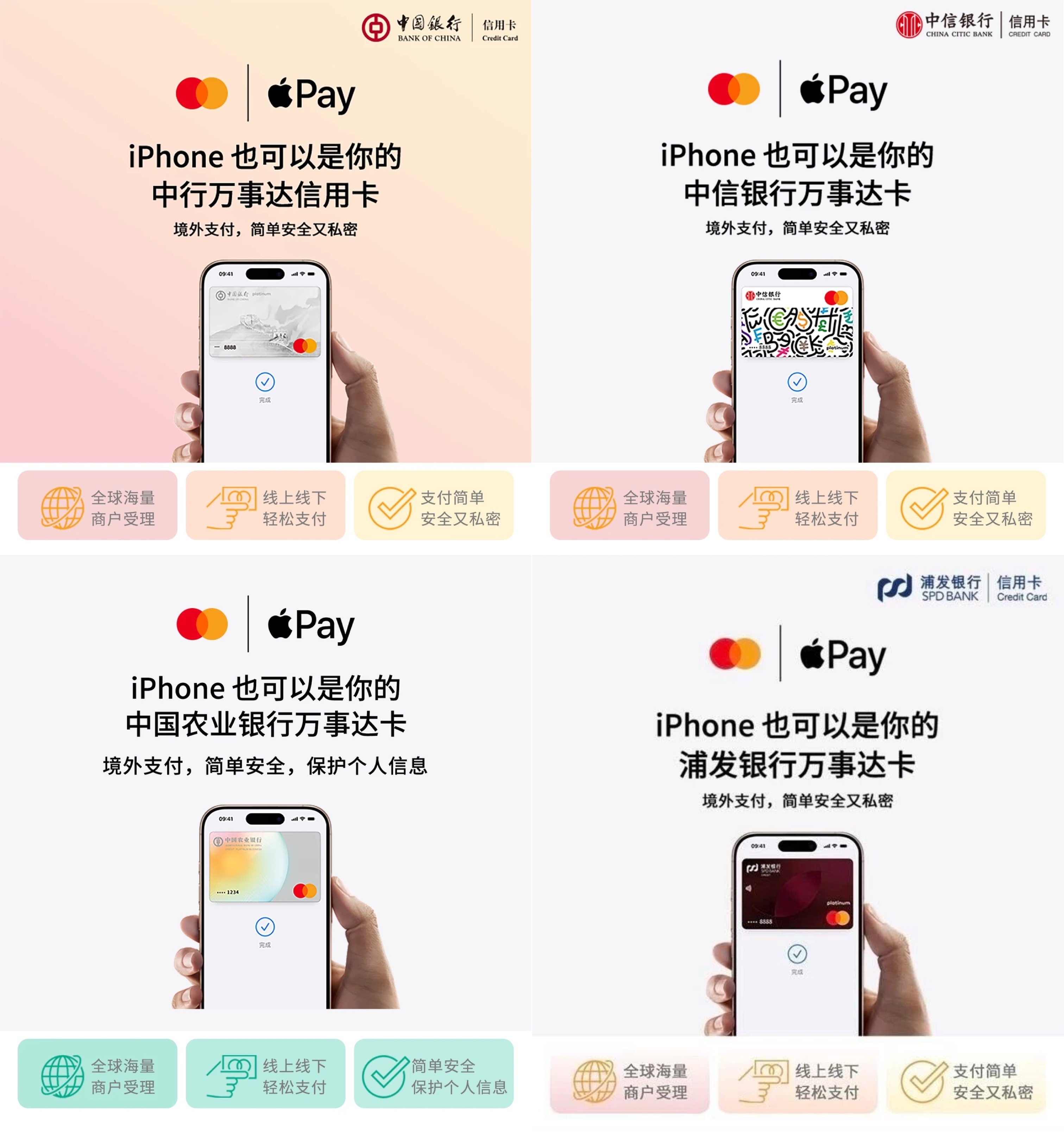 首批支持四家银行,分别是中国银行(信用卡)、中信银行(信用卡和借记卡)、中国农业银行(信用卡)、浦发银行(信用卡)。